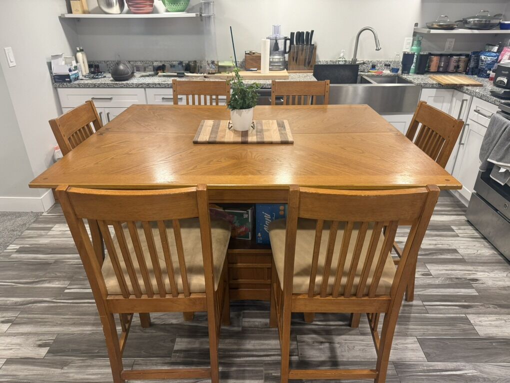 VenmoCounter height table and 6 chairs. Table base includes an enclosed storage area as well as an open shelf for storage. Expanding leaf stored underneath. 48” x 60” expands to 60” x 60” with leaf