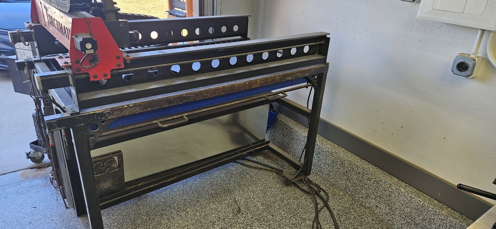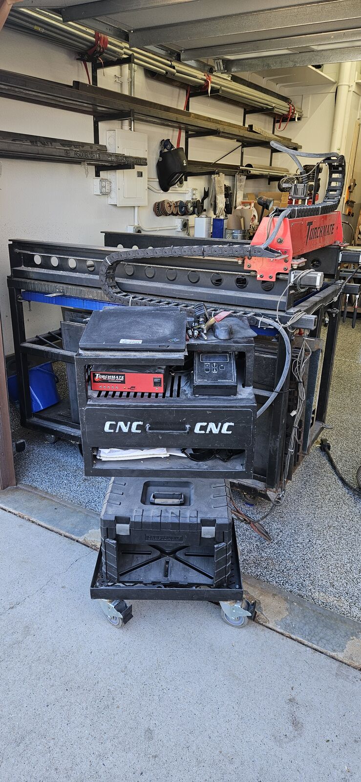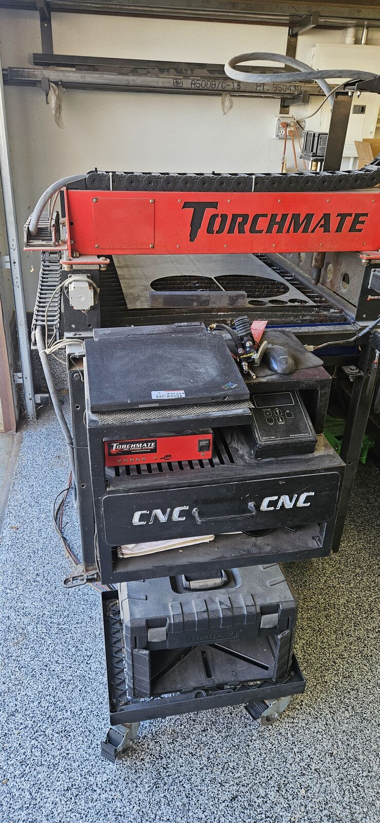Torchmate 2x4 with torch height controller Hypertherm powermax 1250 with Machine torch and hand-held torch Motorguard moisture filter for the plasma cutter Comes with hundreds of dollars of Hypertherm consumables Comes with hundreds of dollars of 2x4 sheets of steel from 16 gauge up to 1/4" thick Mobile cabinet that stores electronics and consumables Old laptop to run the software Custom table that holds ready-to-cut steel underneath, and has a new waterpan (helps contain sparks/smoke)