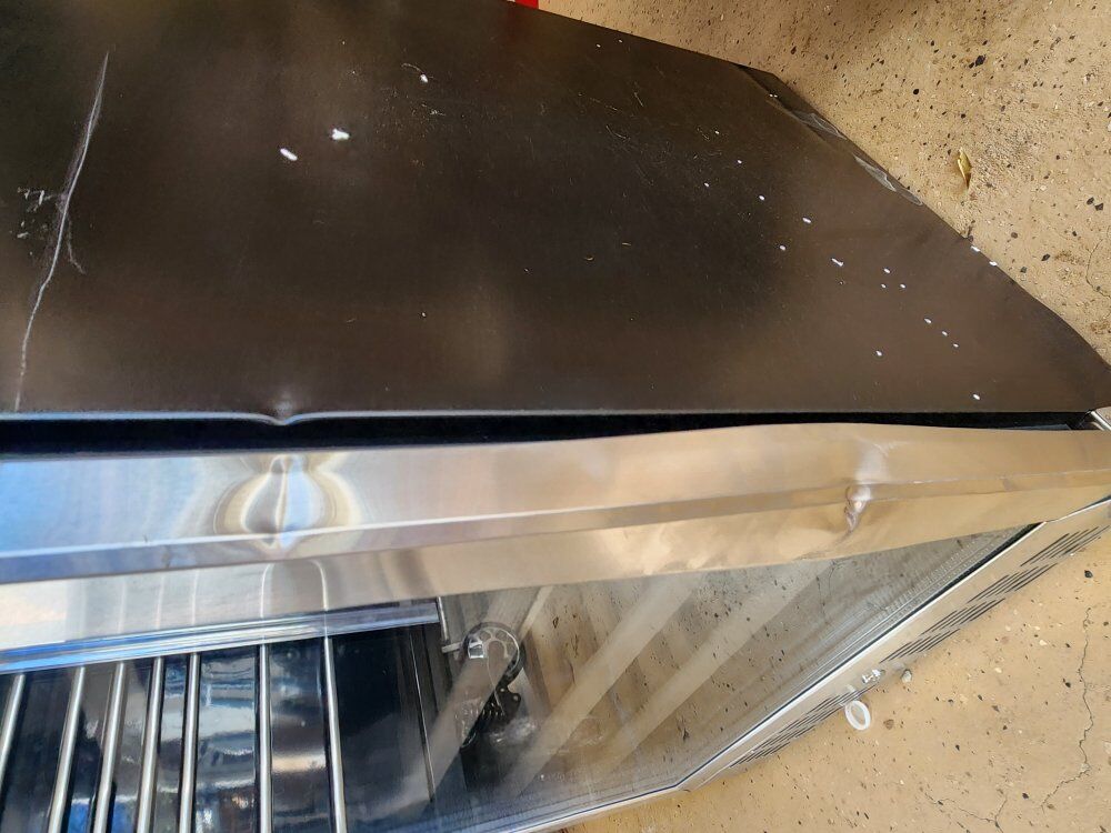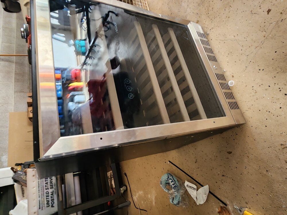 This new wine fridge came from a damaged auction. works fine. some frame damage..good for making cheese as well. H33 W 23.5 D 23 with door