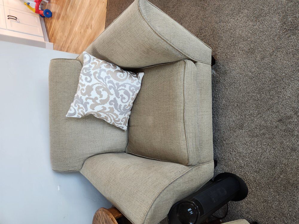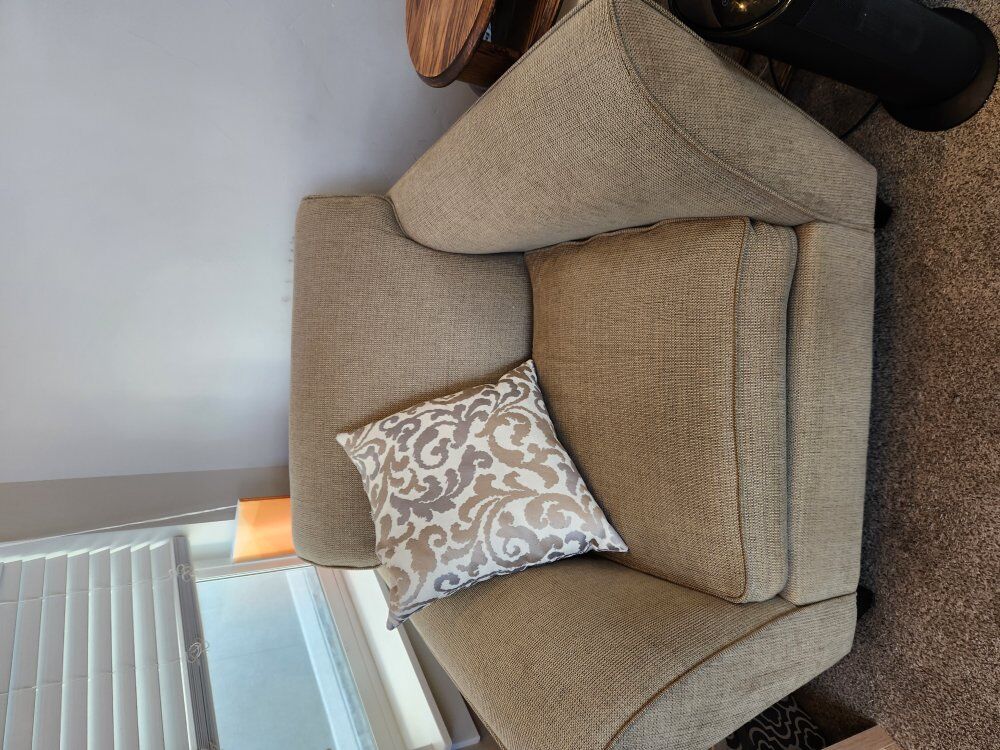 Two great armchairs for sale. 42 inches wide at widest point. 38 inches deep. They are very comfortable and we'd love to keep them if we weren't moving. They don't have any stains or odors and come from a pet and smoke free home.