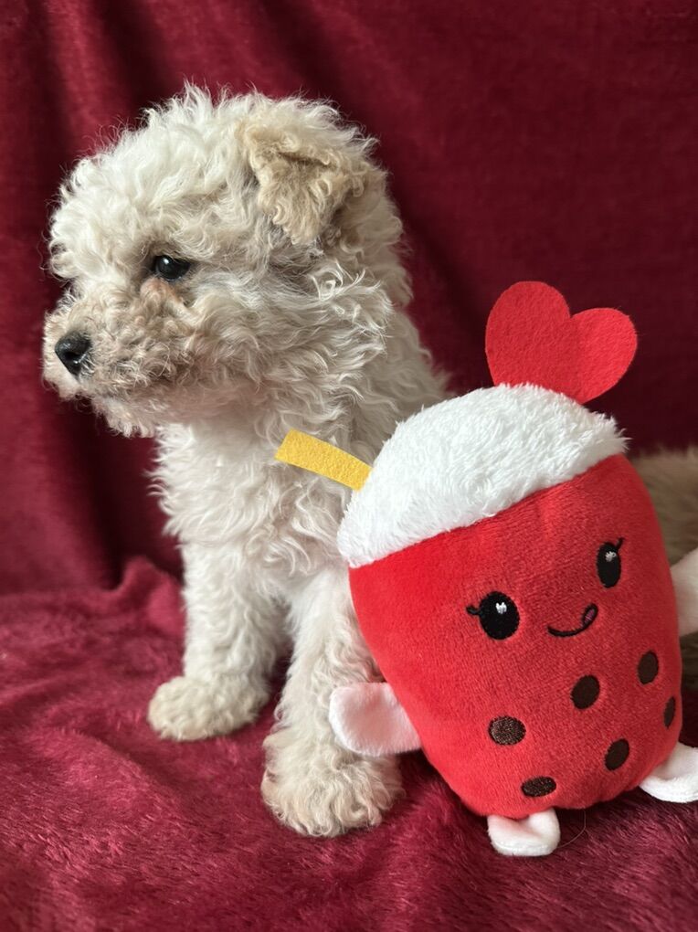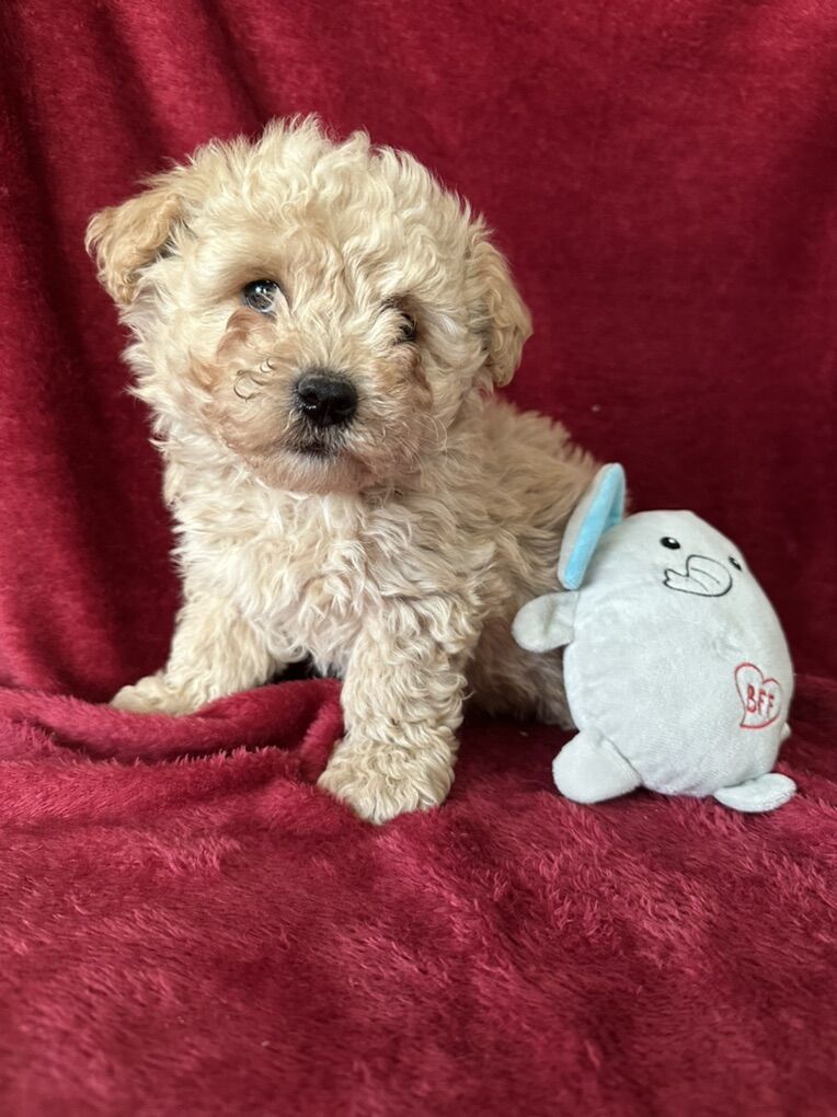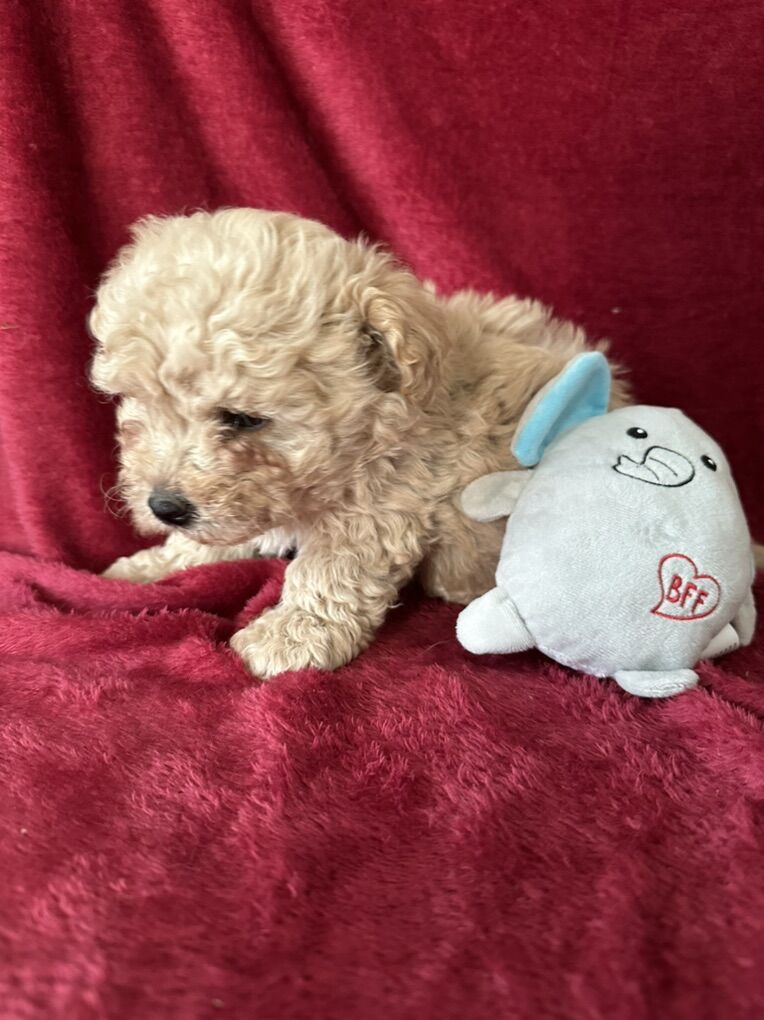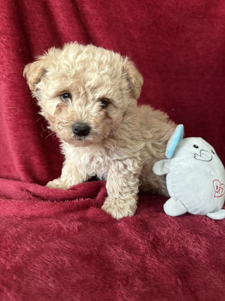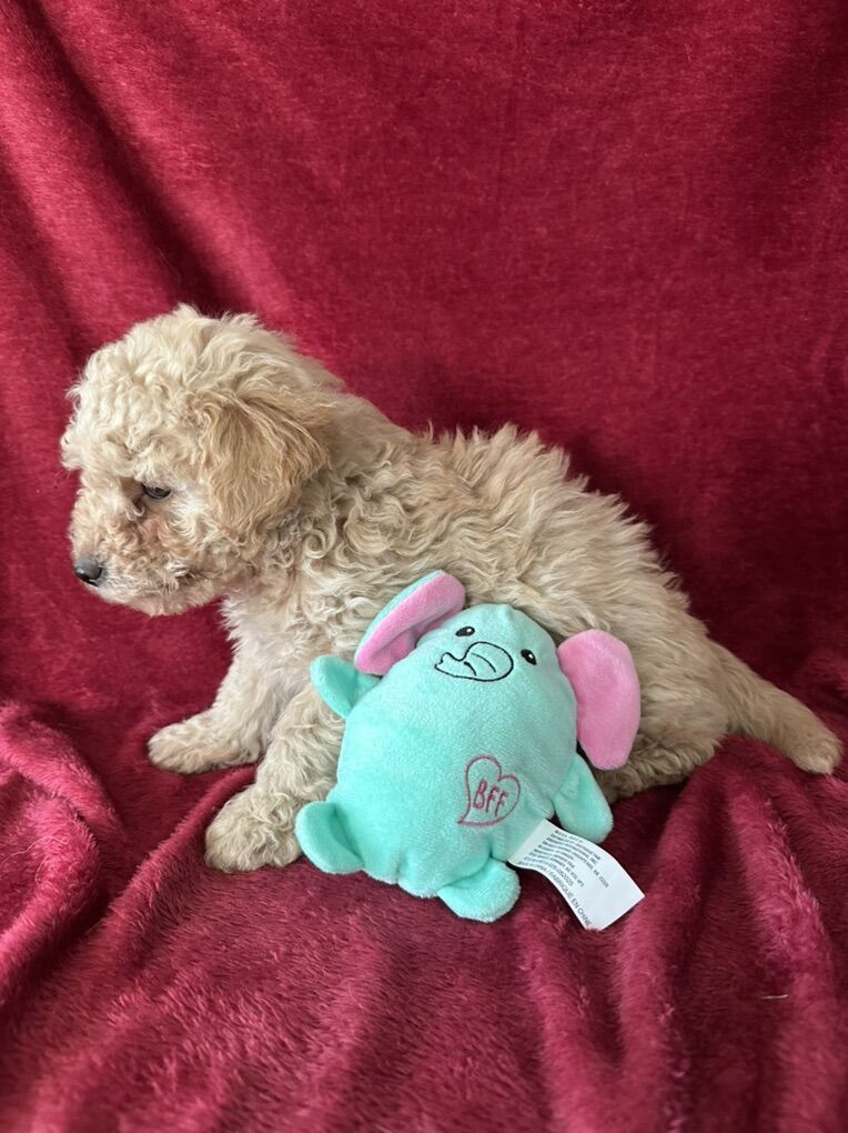 Maltipoo puppies 3 males 1 female.Born on December 10,2025.Puppies had first set of shots are eating and drinking and working on potty training, mom is cream around 12 lbs, dad is white and around 9 lbs. Parents have a sweet and lovely personality. 1. White tiny MALE with red plushy AVAILABLE. 2.Apricot MALE green eyes with green elephant plushy SOLD. 3. Cream FEMALE with pink donut plushy SOLD. 4.Apricot MALE with grey elephant plushy AVAILABLE Last picture is of parents .Cash Only .Please message if interested, have a busy work schedule but will get back as soon as I can.