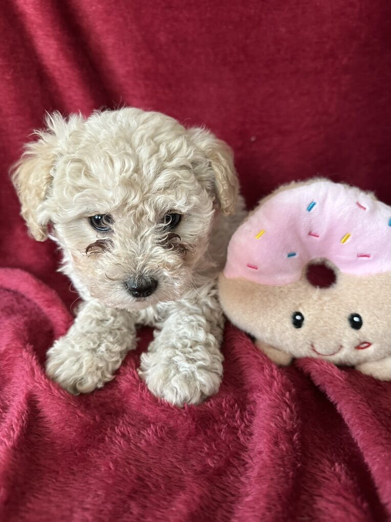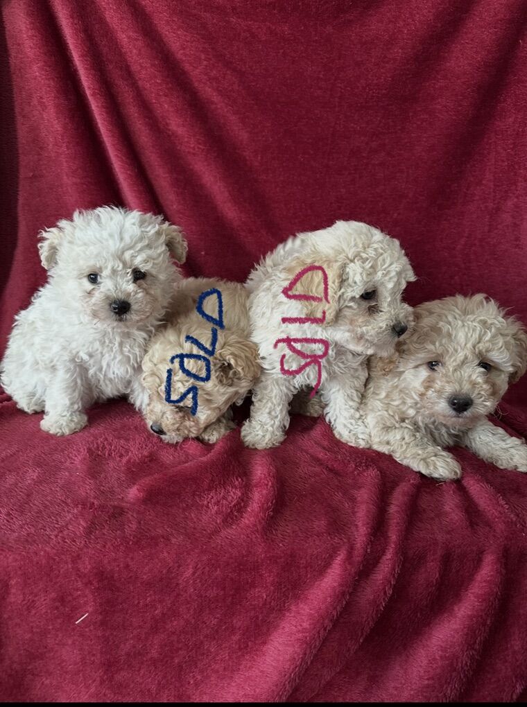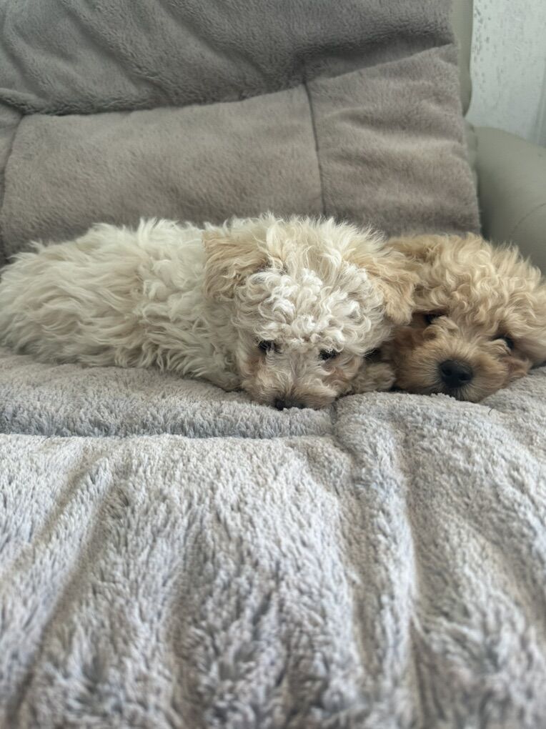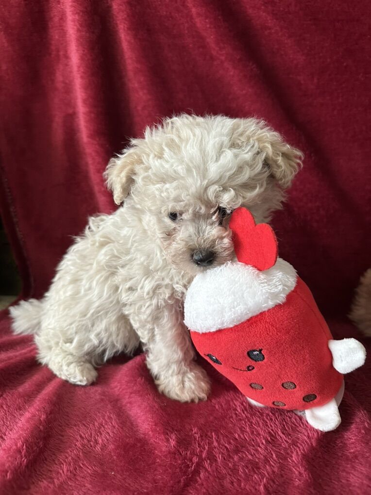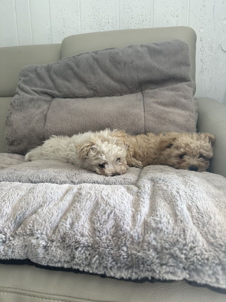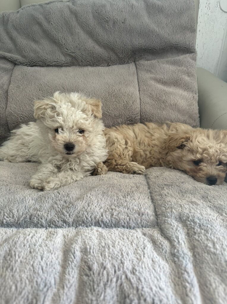 Maltipoo puppies 3 males 1 female.Born on December 10,2025.Puppies had first set of shots are eating and drinking and working on potty training, mom is cream around 12 lbs, dad is white and around 9 lbs. Parents have a sweet and lovely personality. 1. White tiny MALE with red plushy AVAILABLE. 2.Apricot MALE green eyes with green elephant plushy SOLD. 3. Cream FEMALE with pink donut plushy SOLD. 4.Apricot MALE with grey elephant plushy AVAILABLE Last picture is of parents .Cash Only .Please message if interested, have a busy work schedule but will get back as soon as I can.