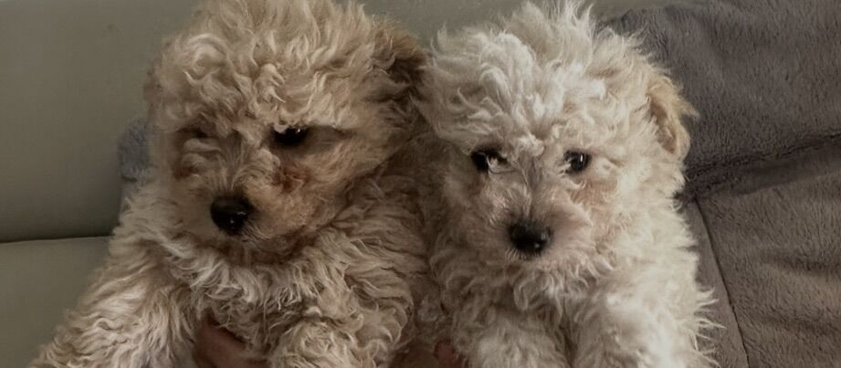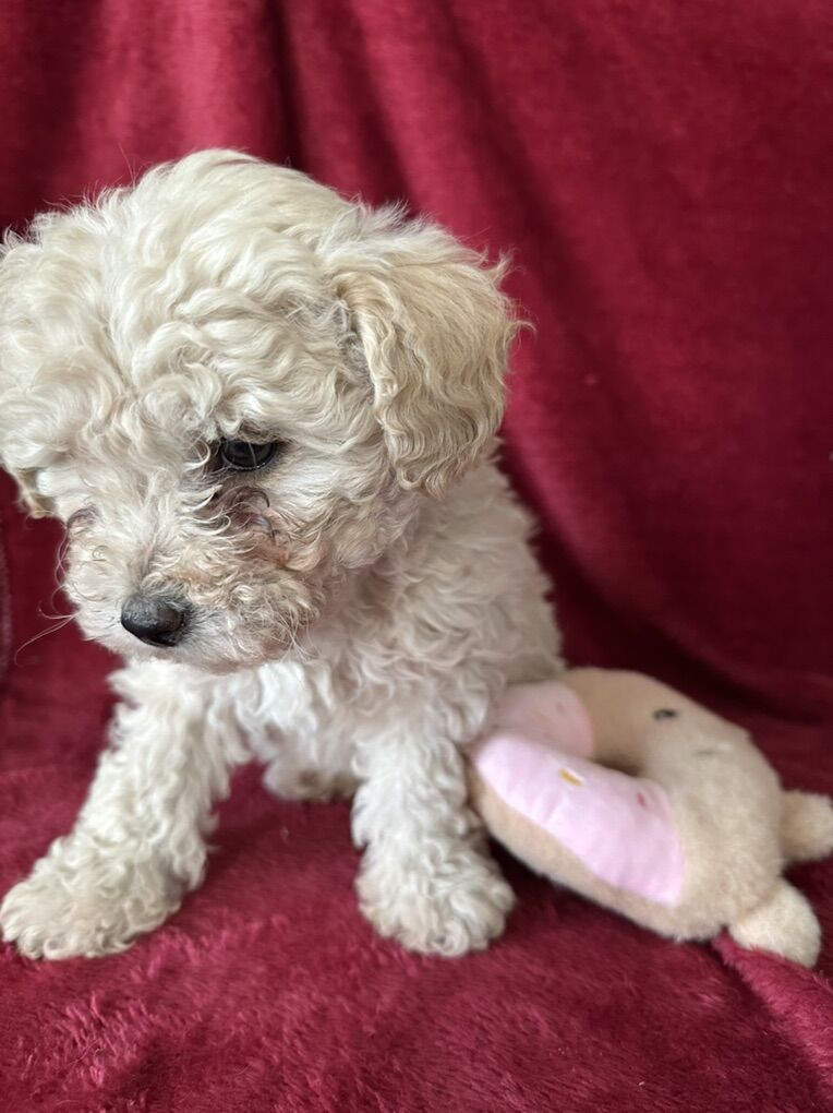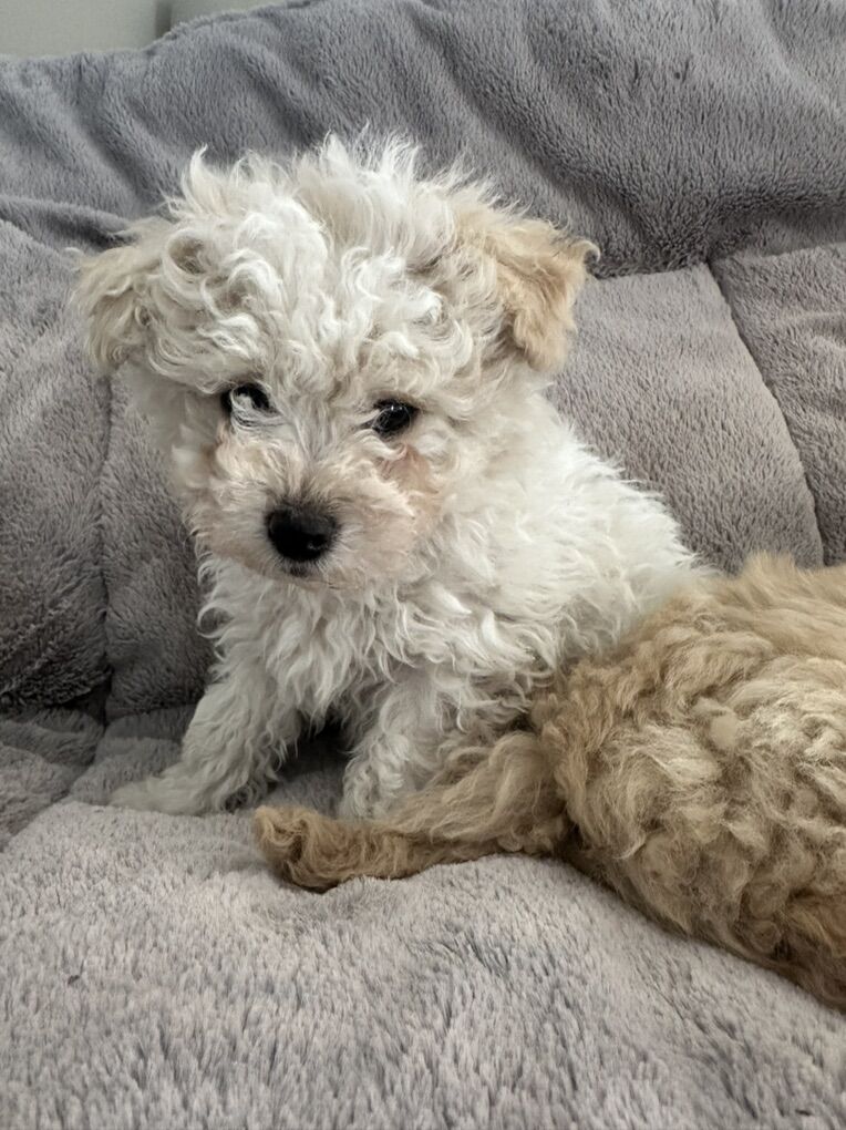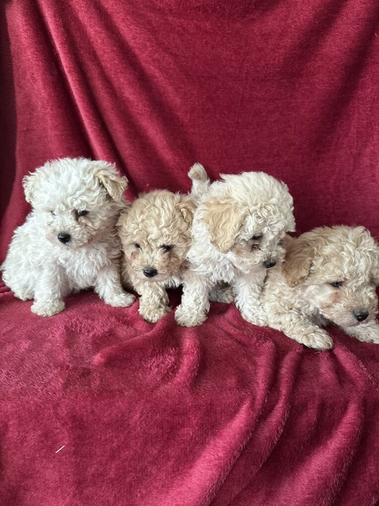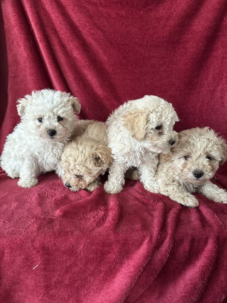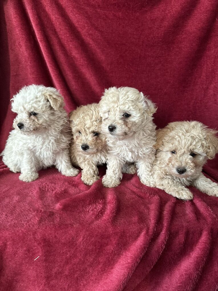 Maltipoo puppies 3 males 1 female.Born on December 10,2025.Puppies had first set of shots are eating and drinking and working on potty training, mom is cream around 12 lbs, dad is white and around 9 lbs. Parents have a sweet and lovely personality. 1. White tiny MALE with red plushy AVAILABLE. 2.Apricot MALE green eyes with green elephant plushy SOLD. 3. Cream FEMALE with pink donut plushy SOLD. 4.Apricot MALE with grey elephant plushy AVAILABLE Last picture is of parents .Cash Only .Please message if interested, have a busy work schedule but will get back as soon as I can.