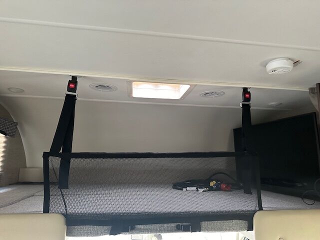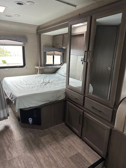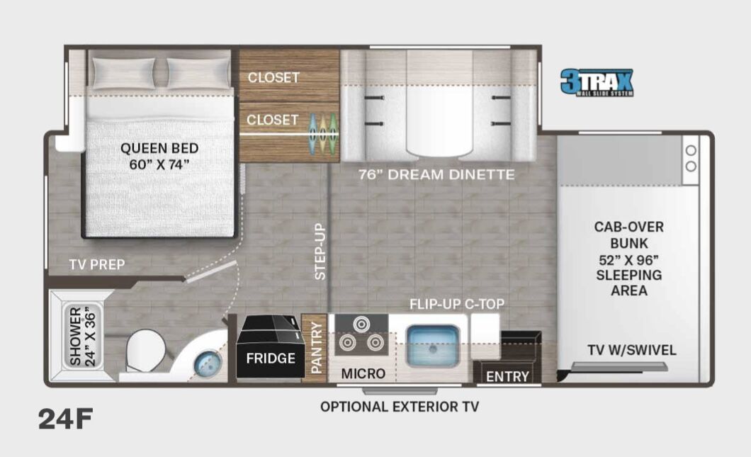 Private bedroom with a queen bed, ample closet space, and a full bathroom with shower, toilet, and sink. Up front, the cab-over bunk adds even more sleeping room, perfect for family or guests. A swivel TV inside and an exterior TV outside means entertainment wherever you are—inside or out.