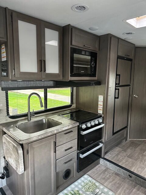 This RV packs comfort and functionality into a smart layout. The side entry opens to a fully equipped kitchen with a 76" Dream Booth dinette that converts into extra sleeping space. Enjoy a stove, microwave, sink, refrigerator, and pantry for easy meals on the road.