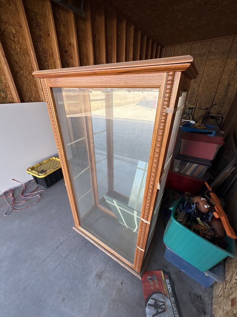 VenmoWood and glass cabinet with mirror in the back and glass shelves (2). Access door (glass) on each side. Small light at the top. Tall 60” x depth 14” x width 31”. I would like someone to get use out of it but if no one wants it by the end of Feb it goes in the trash. No holds, cash or Venmo only Located in storage unit in Tremonton, I can help load but you’ll need another person.