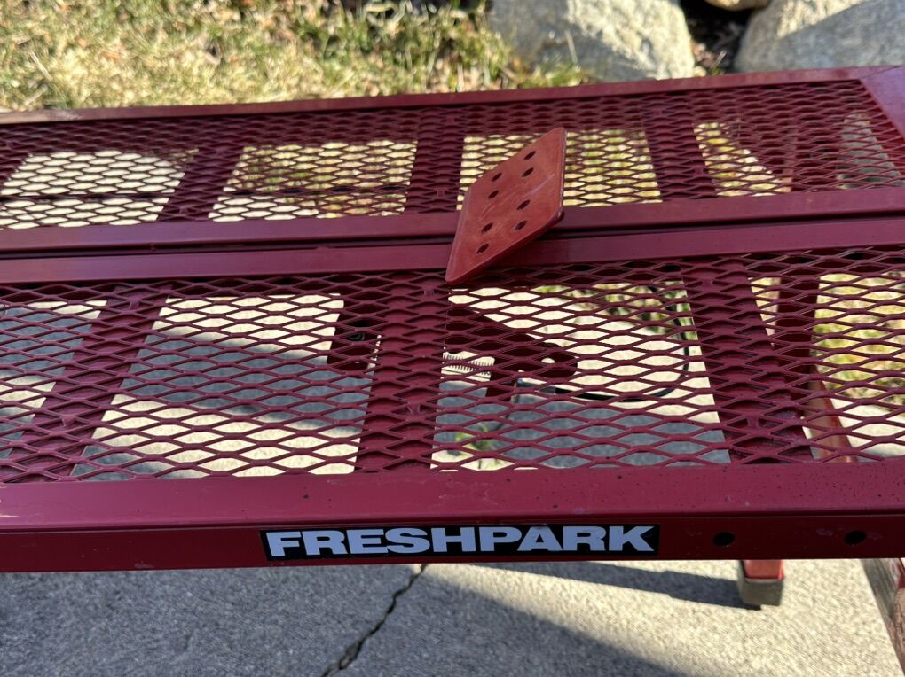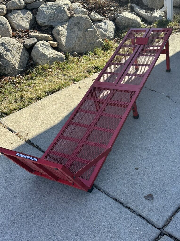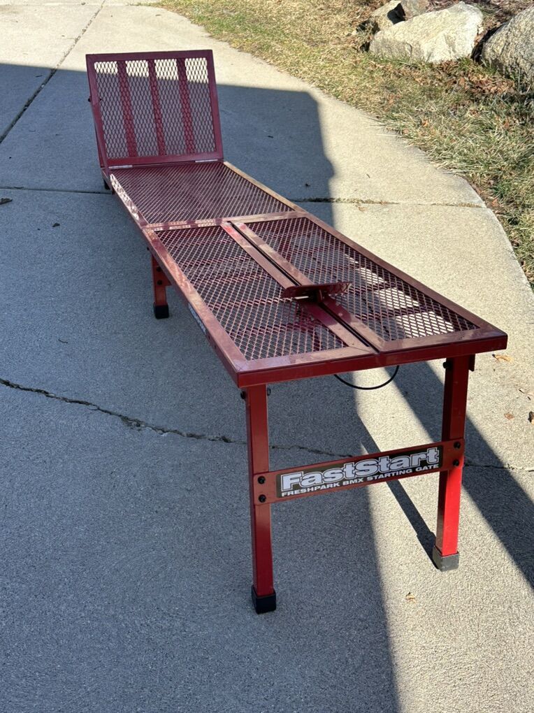 Powder-coated cold rolled welded steel, rubber feet, folding legs, 68lbs, and able to fold up to a flat 5” x 19” x 40” platform.