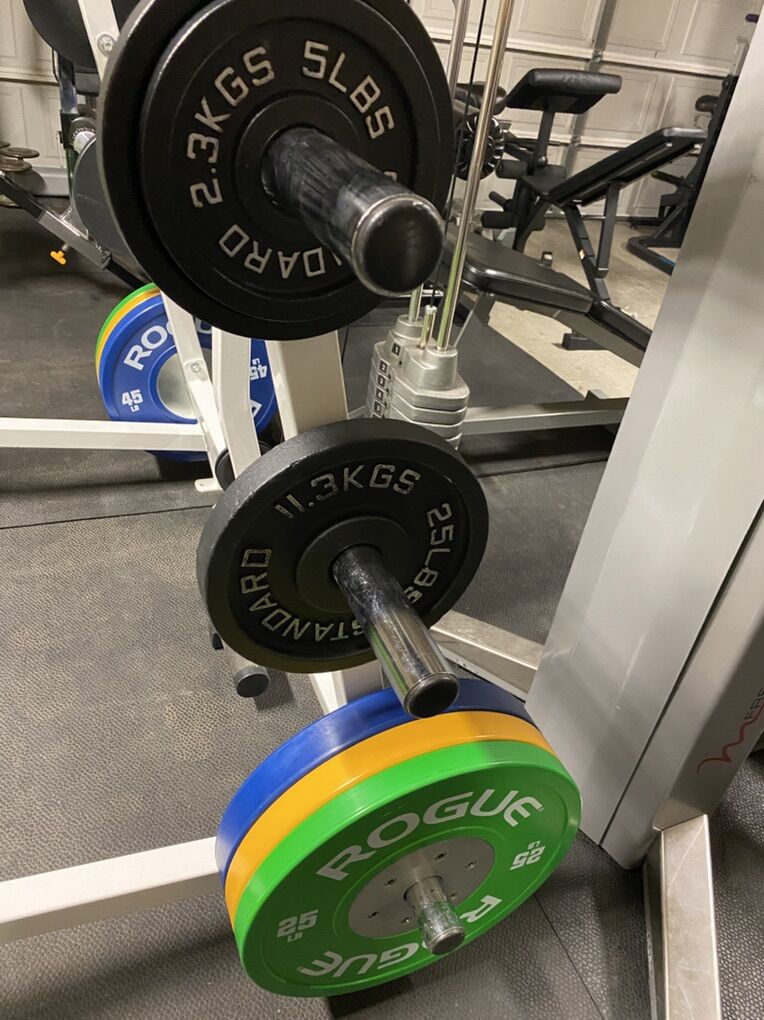 Commercial quality life fitness Olympic Smith machine home gym in new condition. The smith machine has linear bearings making it incredibly smooth and the rack has a gun rack racking system for free weightlifting has post for Olympic storage and an upper and lower pulley system. That is incredibly smooth and comes with several different pulley attachments also included is a rogue competition Olympic bumper plate set along with metal change plates altogether the set up cost well over $4000 new selling for $2100 firm and will not separate. Curbside delivery is also available for gas money.