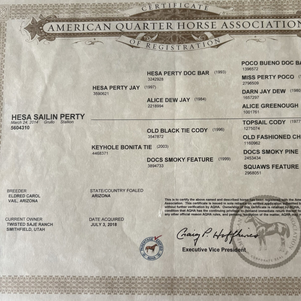 Hesa Sailin Perty- amazing stallion. Throws color but best of all offers his amazing demeanor and temperament as well as athleticism. This foal will be able to do anything you ask it to do and look dang good doing if.