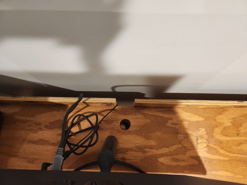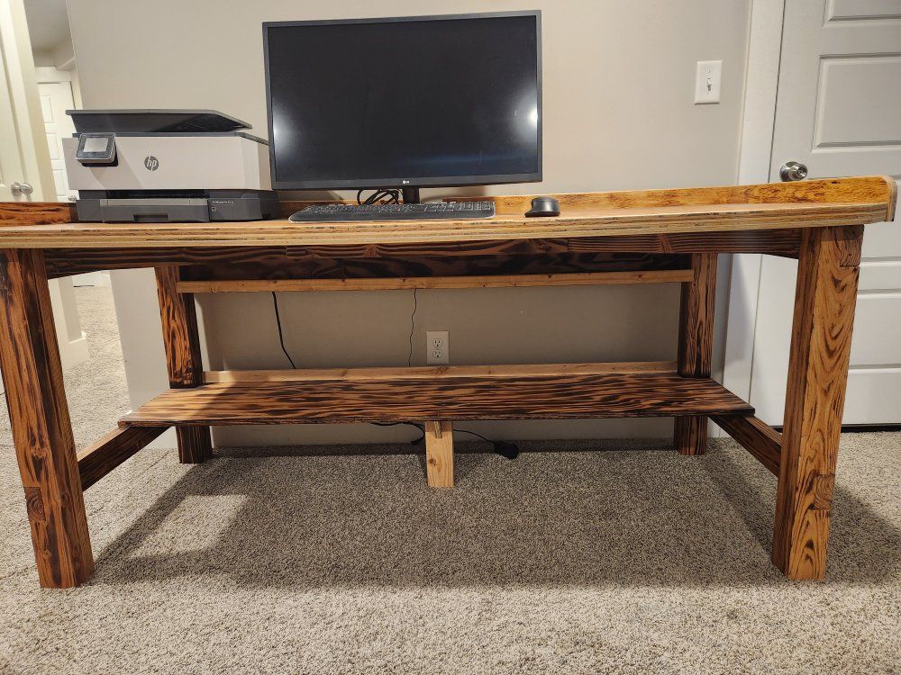 This is a great desk! It is wide and deep allowing for tons of work space and/or storage. It has a shelf along the bottom where I kept office supplies. It has the hole in the back for cords. It's custom built with a heavy duty frame and thick wood top. It's finished with a natural/rustic stain that highlights the wood grain. It is super solid and great as a home office desk, craft table, or workshop bench. It will last forever and if our new house had a spot for it I'd keep it.