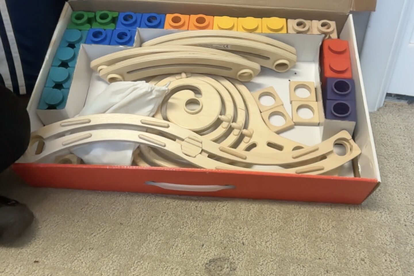 Venmo106 pieces, big wooden blocks and tracks, and standard marbles. Ages 4 plus.