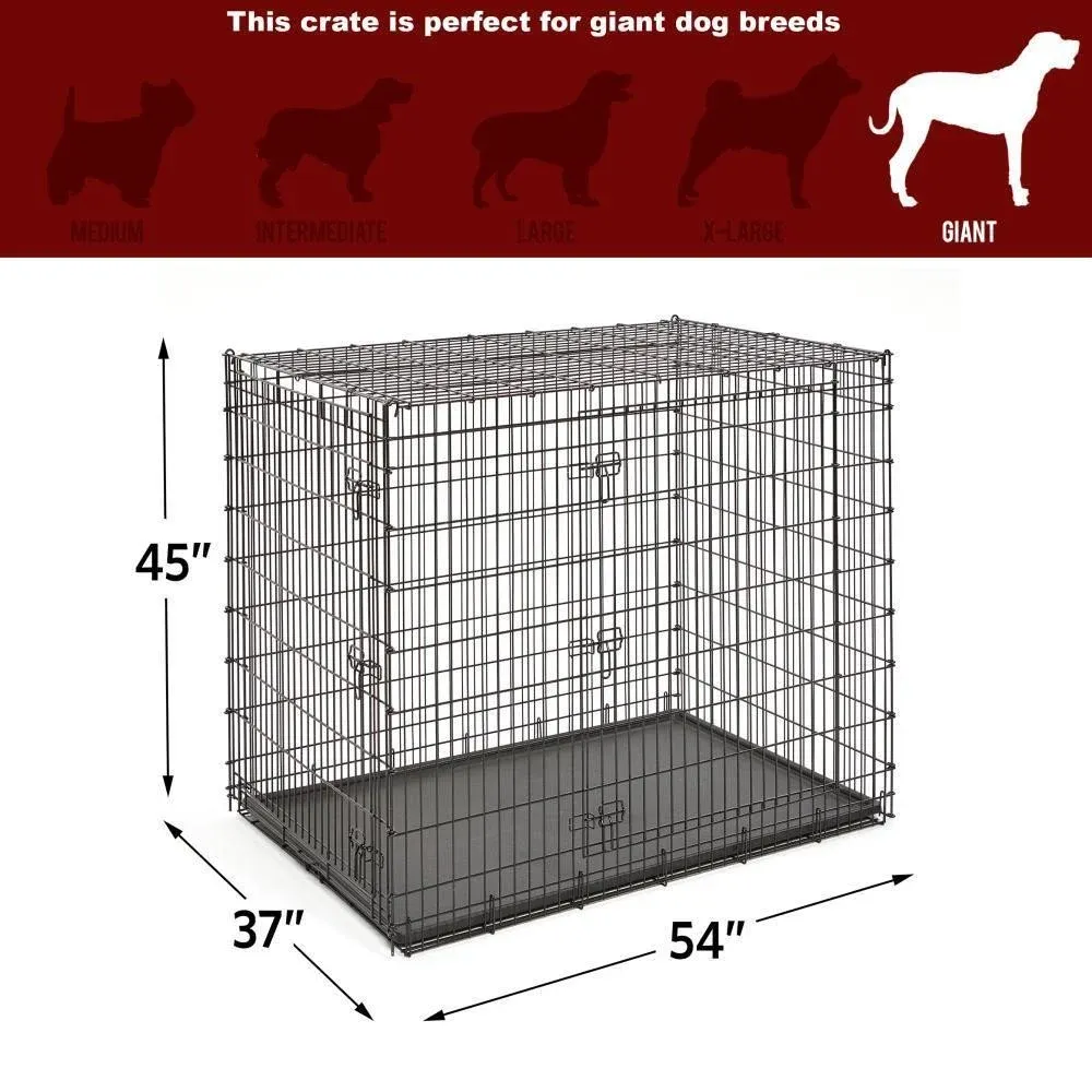 The extra, extra-large double door metal dog crate by MidWest Homes for Pets is specifically designed for the largest breed of dog breeds, including Great Danes, Mastiffs, and St. Bernards. This durable, heavy duty metal dog crate features a two-door configuration with convenient front and side door access, three secure slide-bolt latches per door, four rubber 'roller' feet to protect your floors and a durable easy to clean leak-proof plastic pan. This 'ginormous' dog crate utilizes drop-pin construction (4 drop-pins) ensuring maximum durability to safely and securely handle large breed dogs.