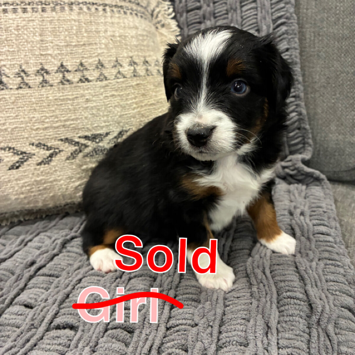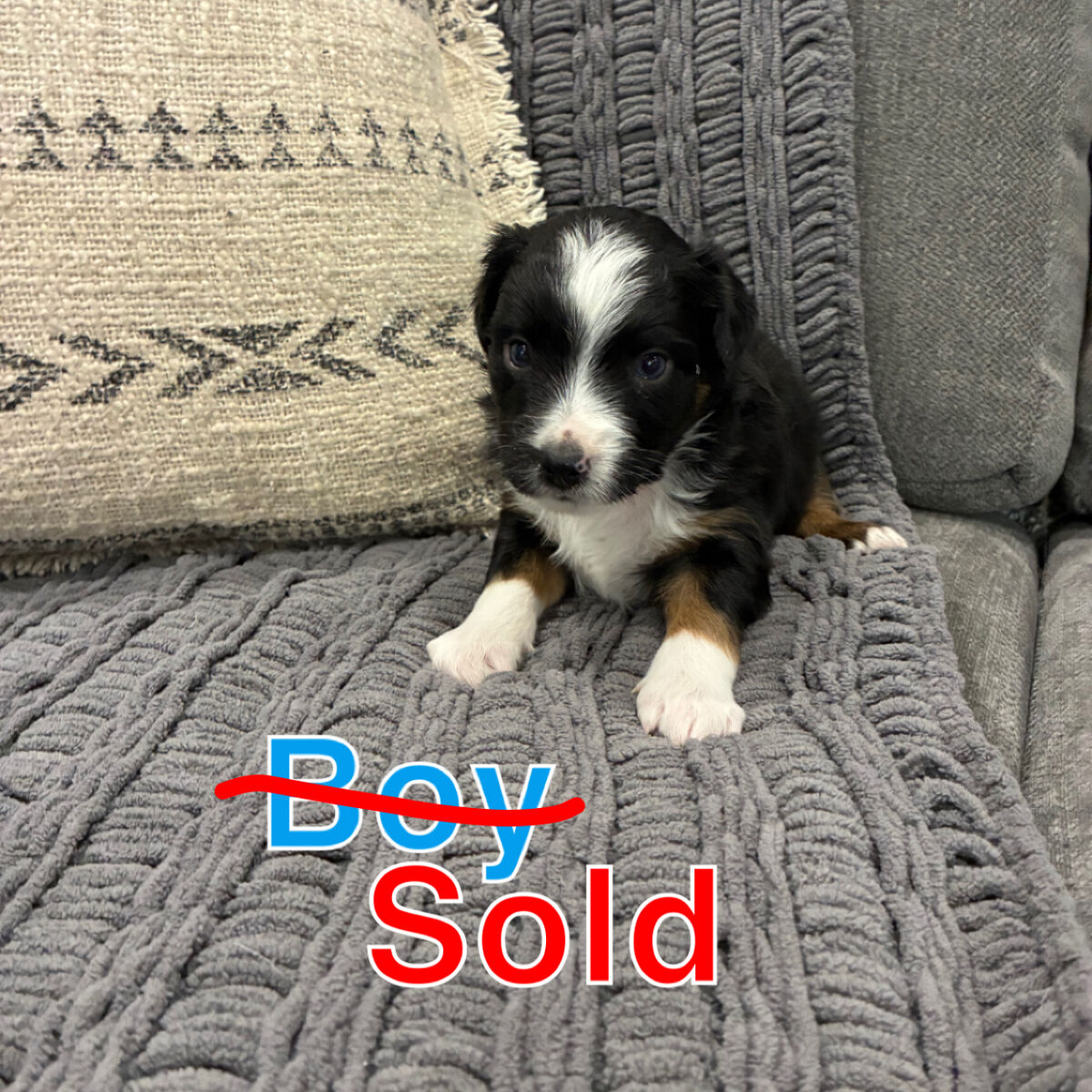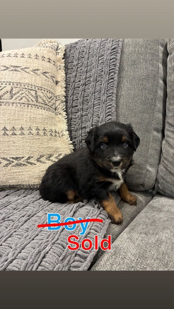Purebred Miniature Australian Shepherd puppies available. We have 9 puppies total: 7 black tri (boys and girls) and 2 blue merle boys. All puppies have docked tails and blue eyes, one puppy having one blue and one brown eye. Puppies are ASDR papered. We own both mom and dad and they are amazing dogs with great temperaments. Black tri puppies are $800 and blue merles are $1,000. Puppies are currently 4 weeks old and will be ready for their new homes February 28th! Message me for more photos or additional information.