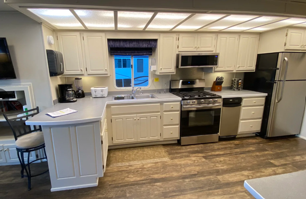 The boat has a nice living room area, kitchen, 4 bedrooms, 2 bathrooms, and a slide. Sleeps 10 inside and has an upper deck for more to sleep. It gets taken care of by Laketime and is 14x65 - The Blue Moon.