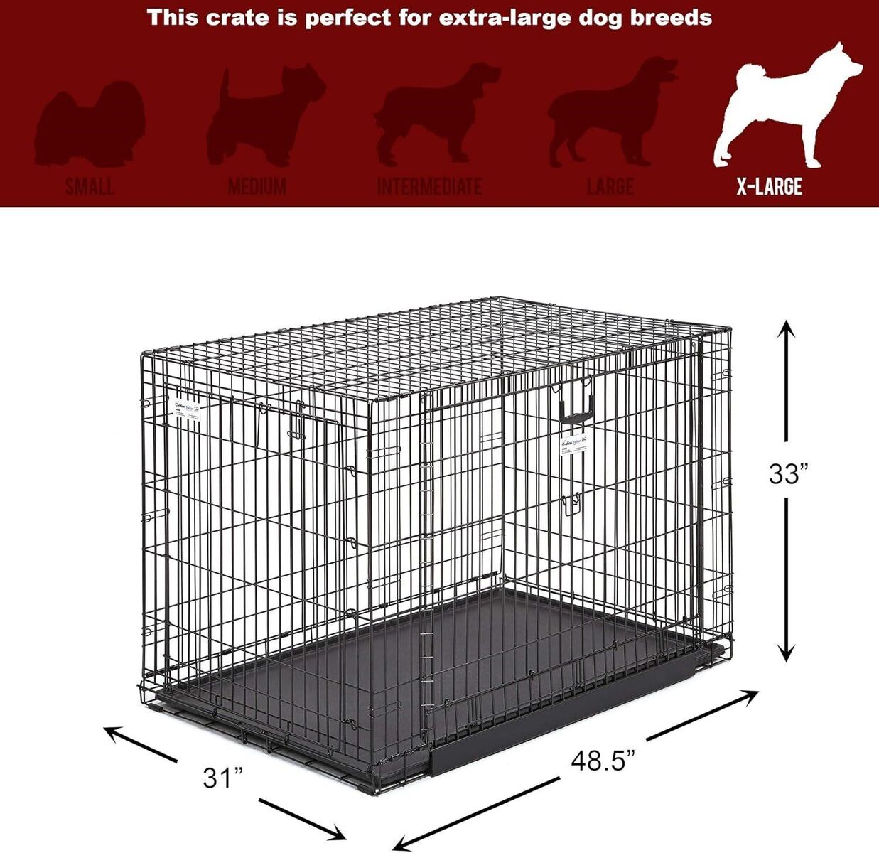 VenmoDesigned for Extra-Large Dogs: Measures 48.75 x 30.75 x 32.75 inches; sized for extra-large breeds between 90-110 lbs. For dogs near the upper size limit, consider sizing up for added comfort. Two-Door Design for Versatile Training: Features a traditional swing-out front door for early training and a garage-style side door that stows overhead for space-saving convenience. Space-Saving Garage Door: Patented Up & Away side door opens upward and locks in place; useful for small rooms or homes where space is limited. Durable and Secure: Built with a strong steel channel track and easy-lift door handles; provides reliable security during use. All-Inclusive Crate: Includes a divider panel for growing dogs, a leak-proof plastic pan, carrying handle, and rubber feet to protect floors Retail $199