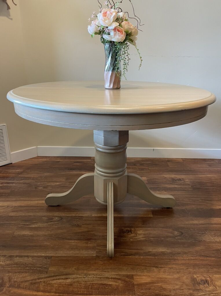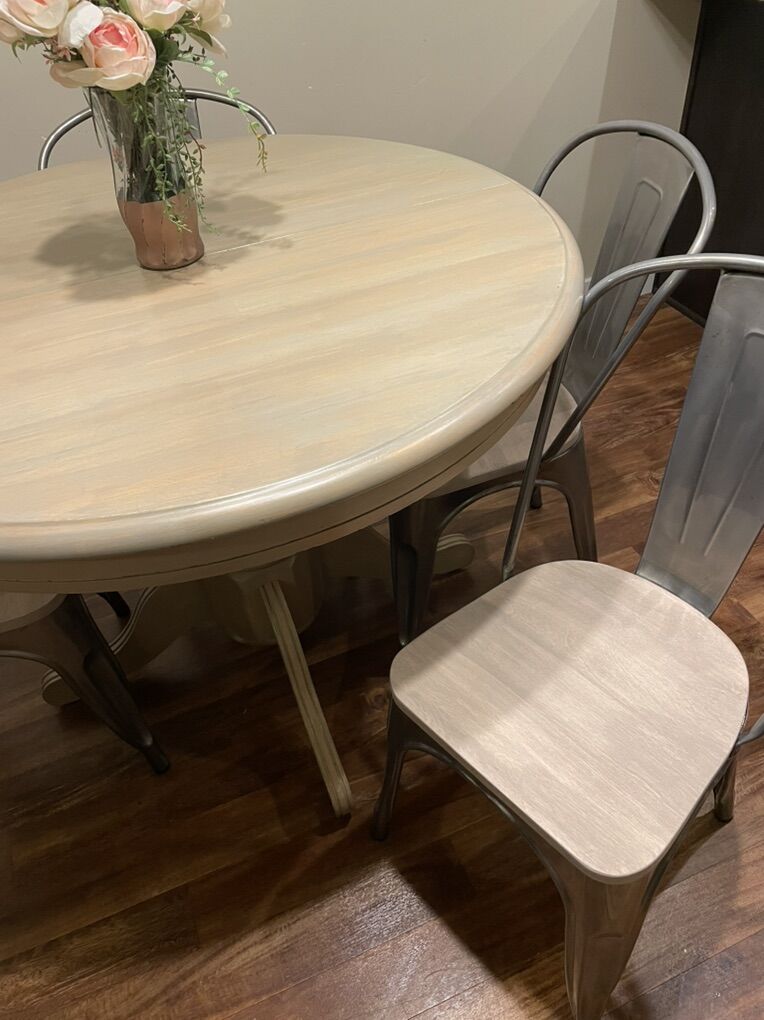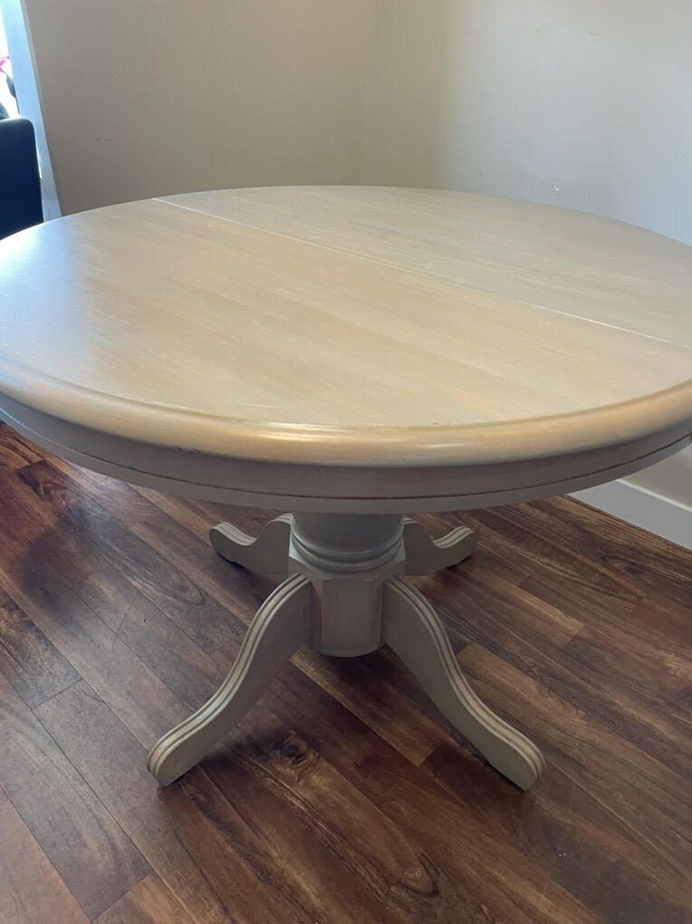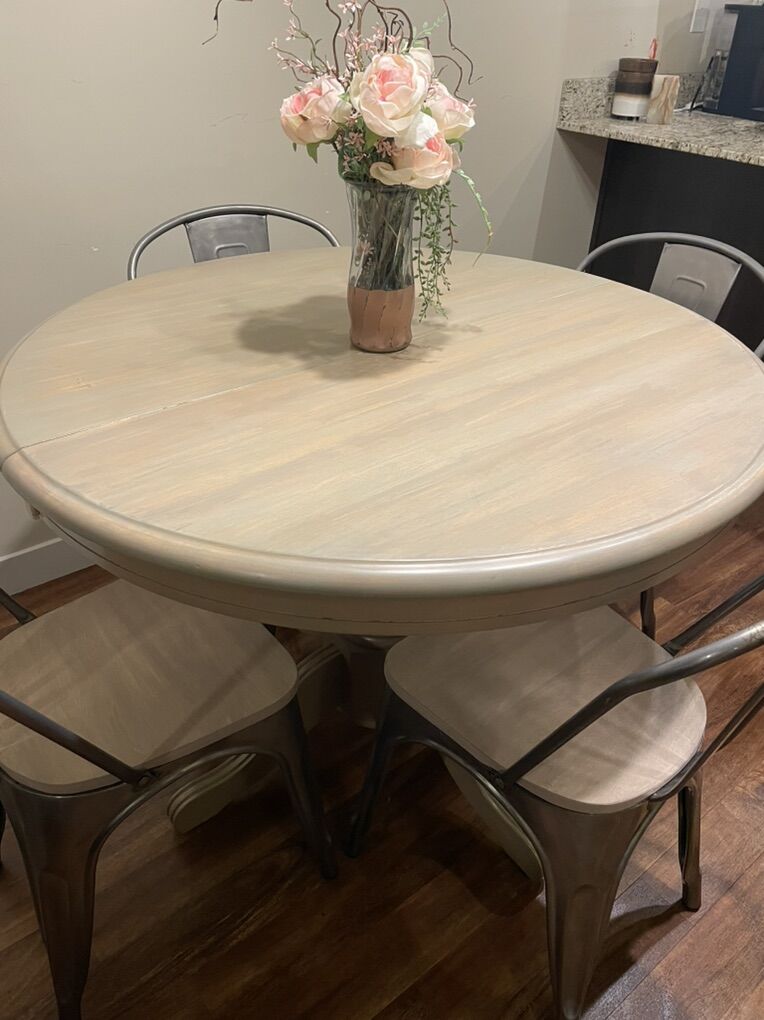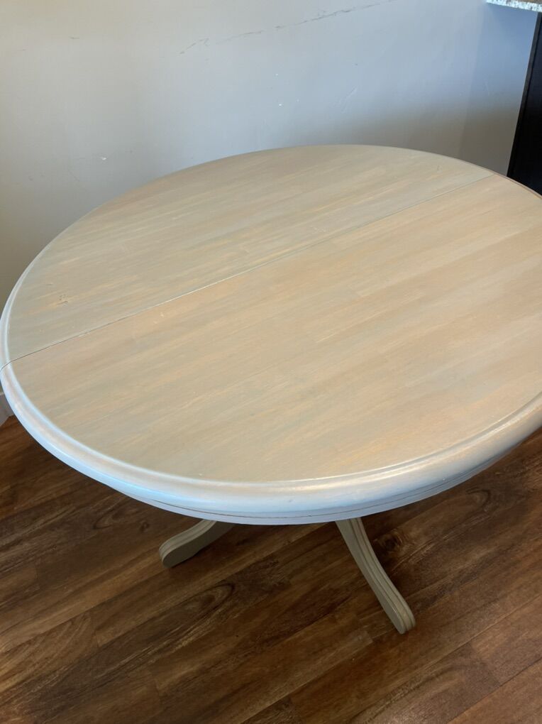 Just refinished like new in washed tan. Covered in polyurethane to last a lifetime. Solid wood, sturdy, ready for a new home! Includes 4 chairs.