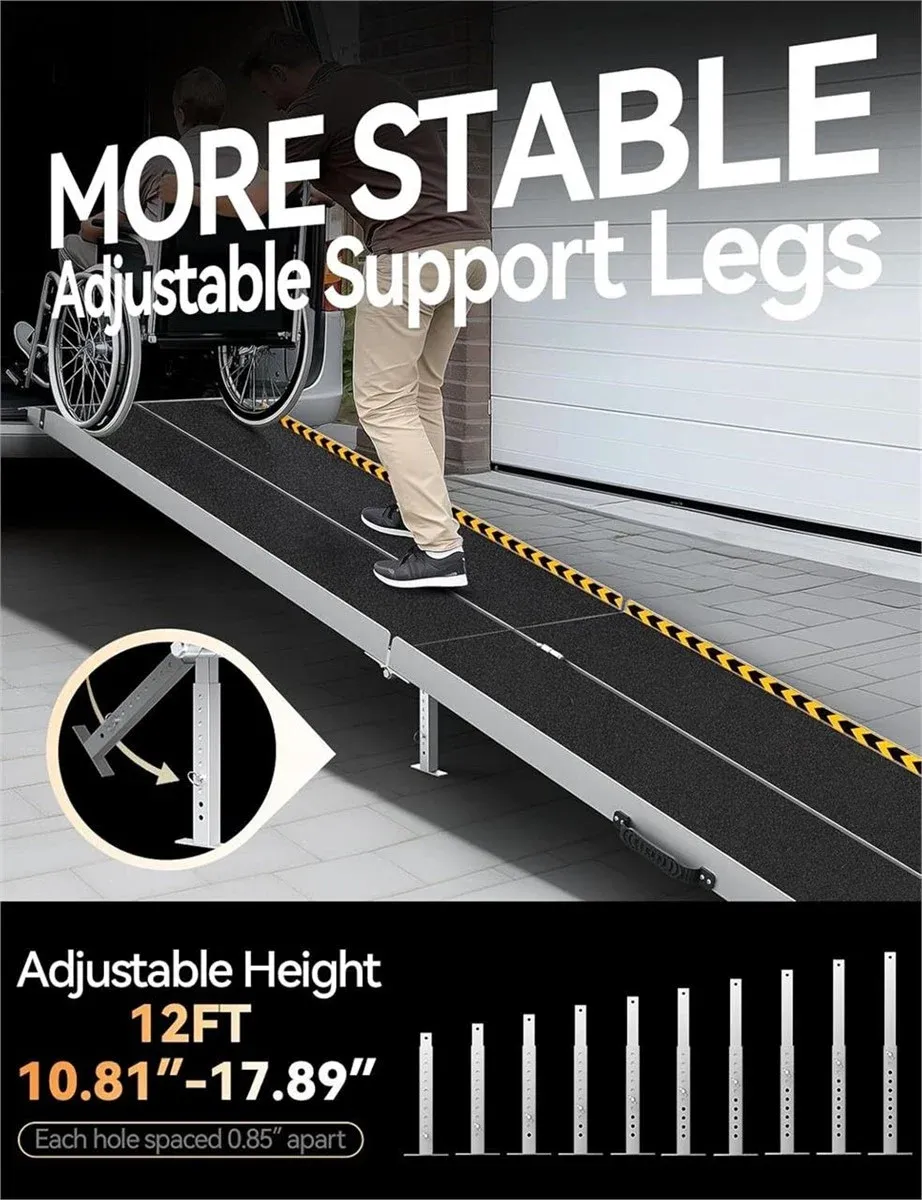 VenmoWHEELCHAIR RAMP 12FT (12FT Unfolded Size: 144x29x2, Folded Size:72x14x 6 ) It is recommended to use a height of 12 inches - 36 inches(It is not recommended to choose a wheelchair ramp with a length less than four times the height of the steps.).The 12FT ramp is large and weighs 68 pounds, so it is recommended that more than one person carry it, but the detachable design makes it easier to carry.Buyers please refer to the size guide before purchasing ramps. The maximum load of the wheelchair ramp is 800lbs. It is normal for a long ramp to sink during use, it will rebound shortly afterwards. ENSURE SAFETY Baffles and reflective strips are installed on both sides of the newly upgraded ramp to prevent accidental falls, and it can be used safely in dark conditions. There are extended guide rails at the top and bottom of the ramp to fit the ground and Prevent falls. DOUBLE REDUCED SLIPPERINESS The aluminum surface of the wheelchair ramps for steps has a non-slip layer, and the pleated design increases friction for maximum safety. DURABLE The FACHNUO TOOL wheelchair ramp is made of exclusive high-quality aluminum and is equipped with a strong stainless steel hinge, which is corrosion-resistant and rust-proof to ensure the long-lasting durability of the ramp. PORTABLE The folding portable ramp has a portable handle like a suitcase, which is lightweight and easy to transport. It is very convenient enough to pass most manual or electric wheelchairs, trolleys, scooters, walkers, etc. Retail $685