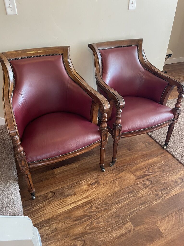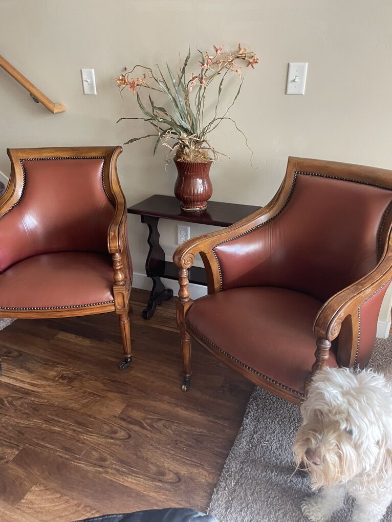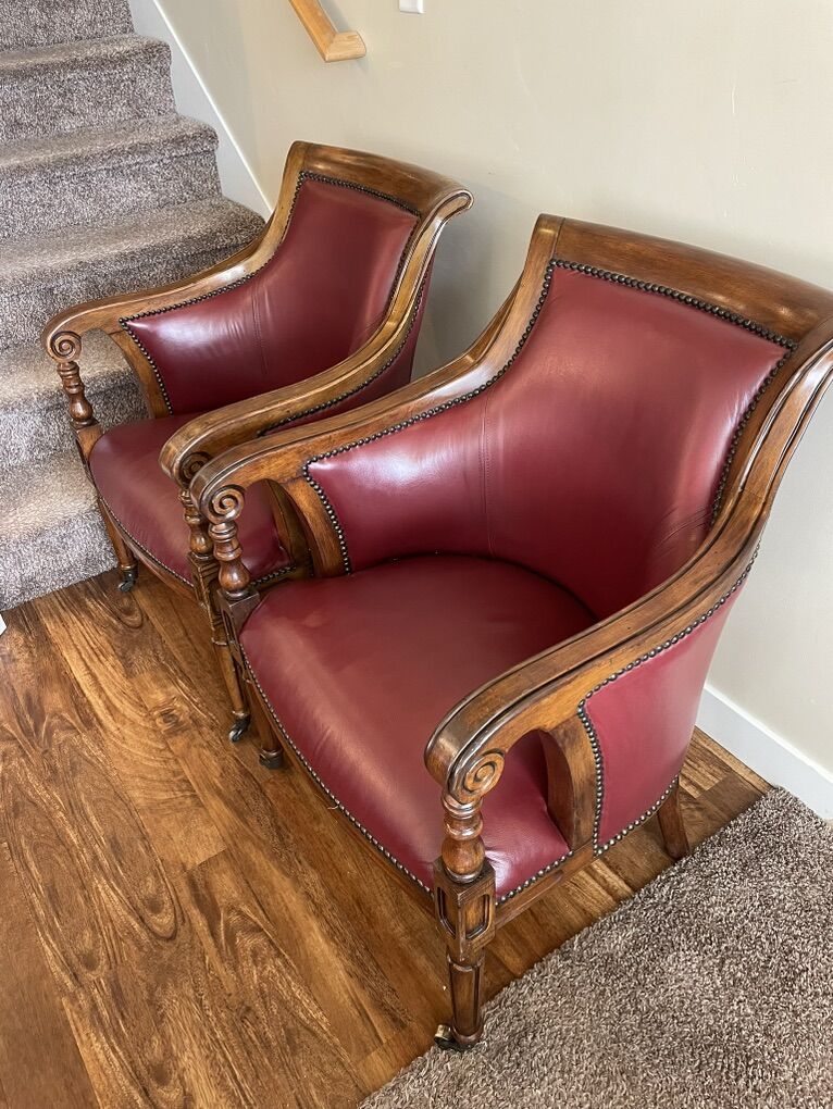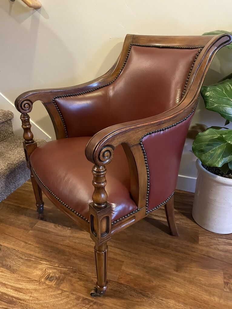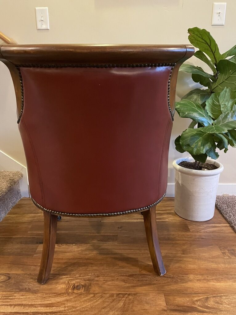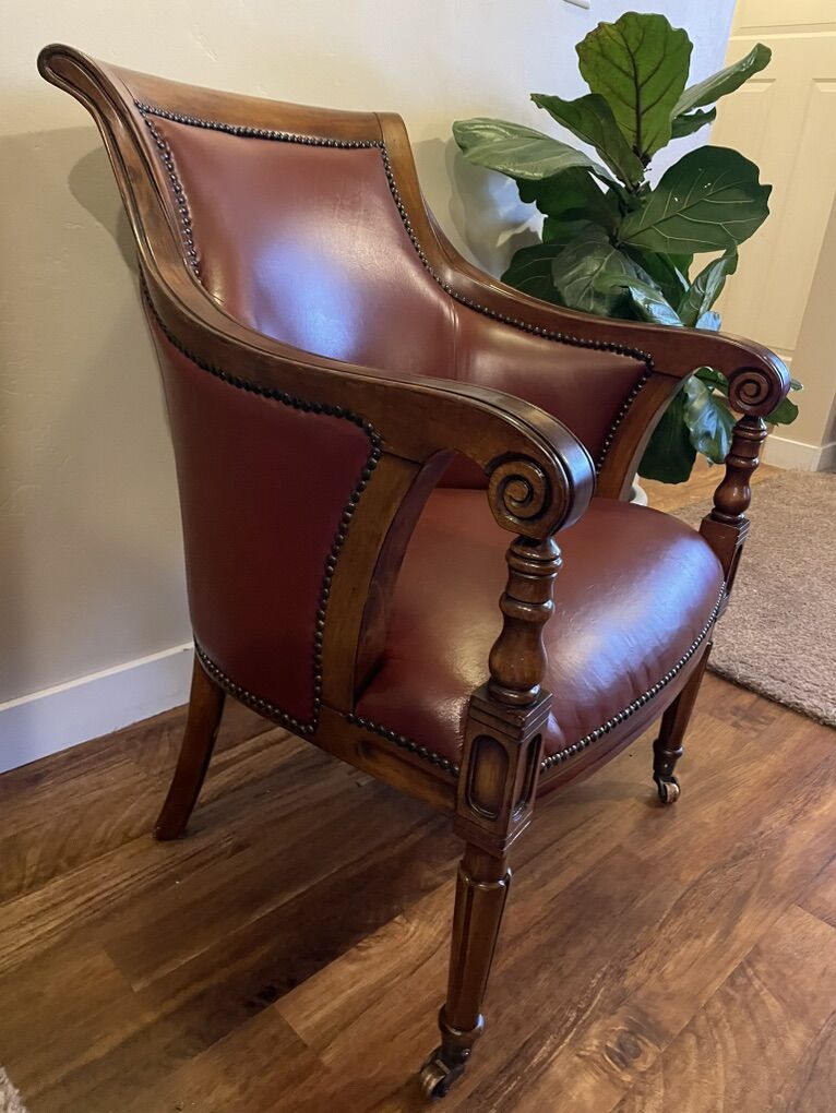 Louis XVI Chair With Nailhead Trim armchairs, refinished like new! The Heather Brooke Top Grain Leather Accent Chair is a perfect addition to any living room. Its casual style and brick red color bring a timeless charm to your space. The chair features beautiful decorative solid wood, nailhead trim, and caster wheels.