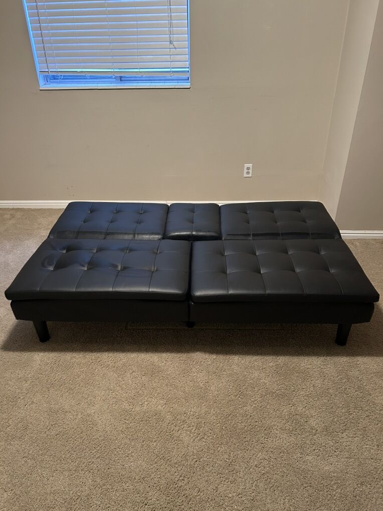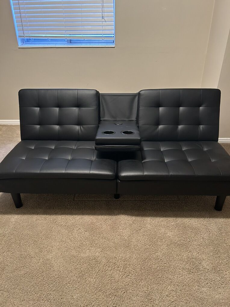 Black vinyl futon. Measurements: L: 72” W: 42” H: 16”. Has power to center cup holders. No pets in the home.