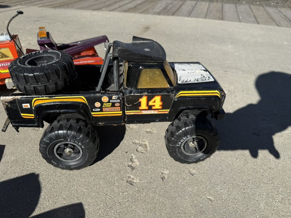 VenmoBlack Tonka truck, green ertl John deer tractor and trailer, orange nylint tow truck. Not sure what scale they are.
