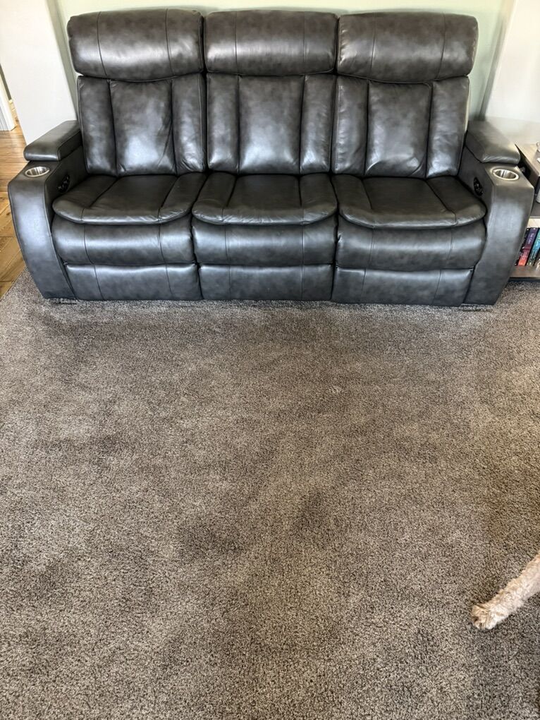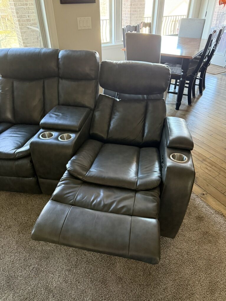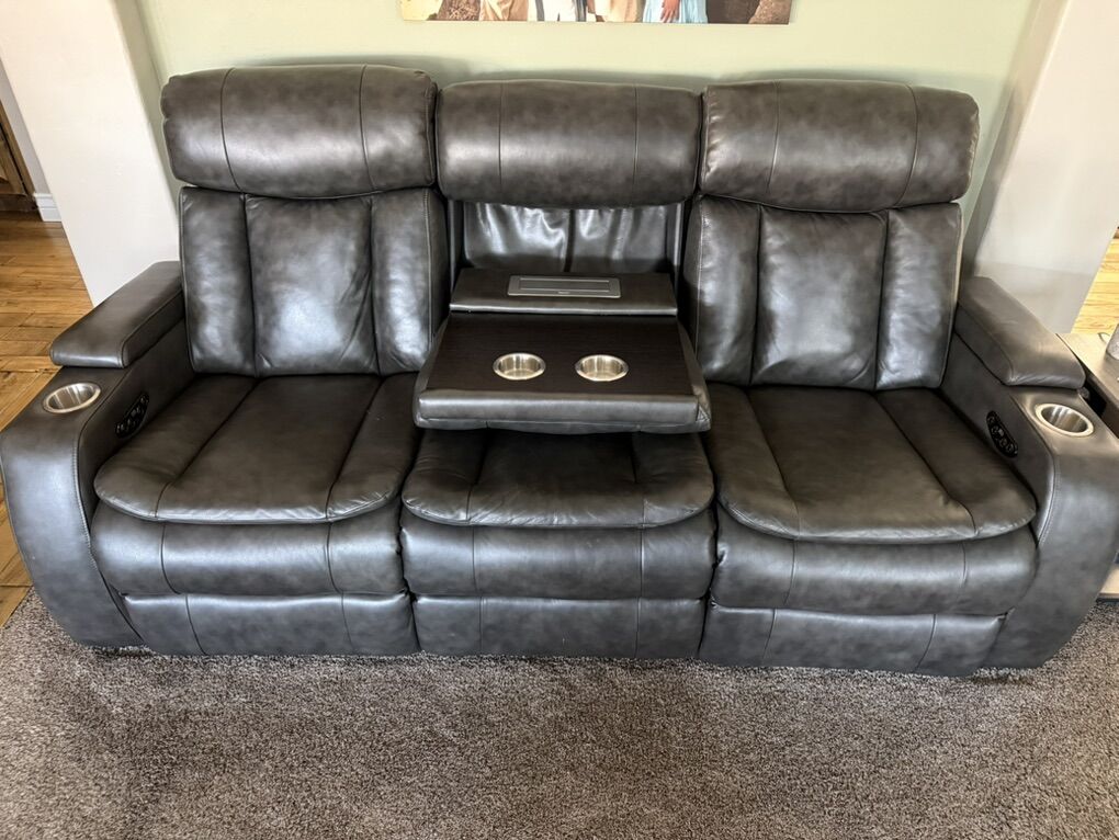 Barely used couch and loveseat, all chairs recline and the headrest moves, with charging ports on all seat. Middle seat plus down with lights and charging plugs! Lots of storage and very comfortable! Changing our decor, smoke free home. We do have a golden doodle but he is not allowed on the furniture.