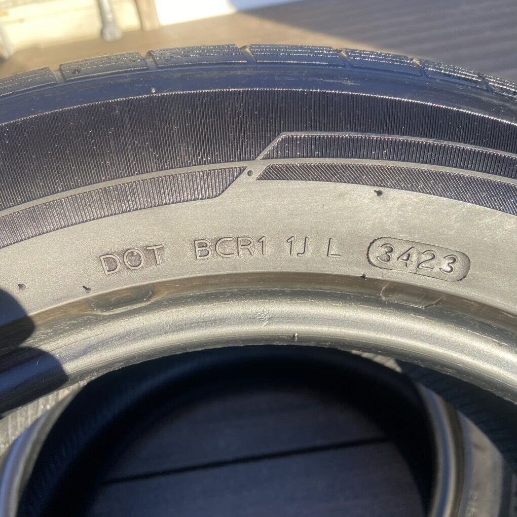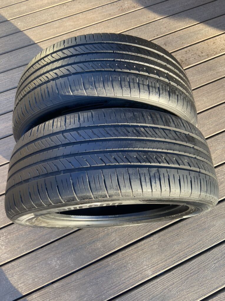 Pair of All Season tires in great condition. About 60% of tread life. From 2023 just barely took them off. No patches or edge scrubbing. Even tread.