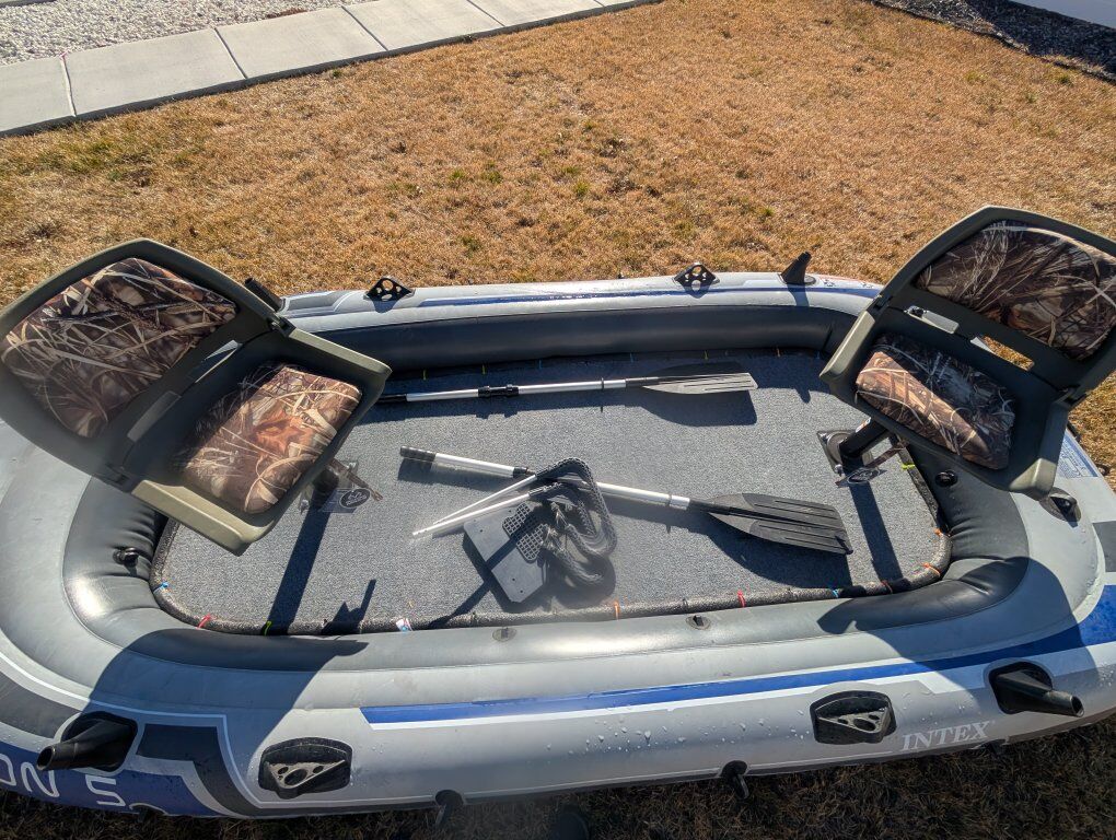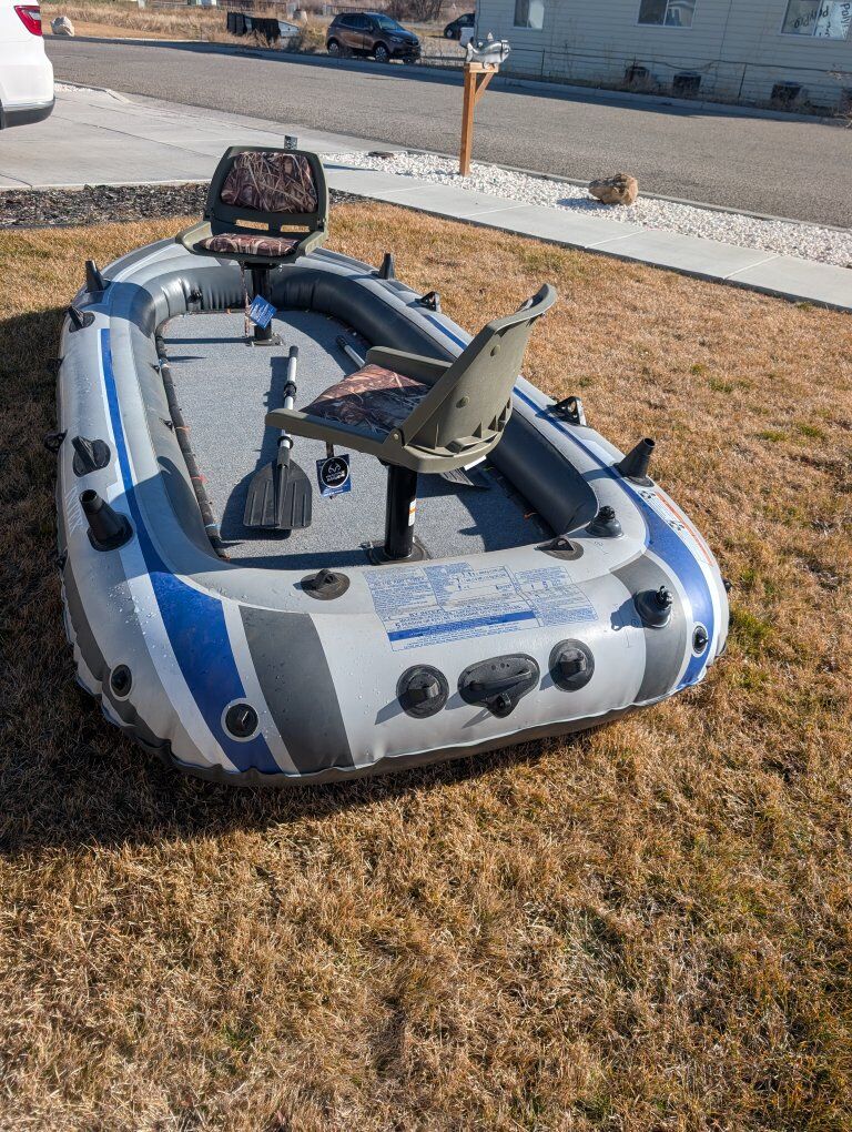 Venmofun little inflatable boat with added deck and fishing swivel seats. getting ready to move and don't have room for it. only has been used a couple times, holds air, chairs still have tags on them. comes with ors and motor mount. deck comes out as one piece and can deflate boat for easy storage and travel.