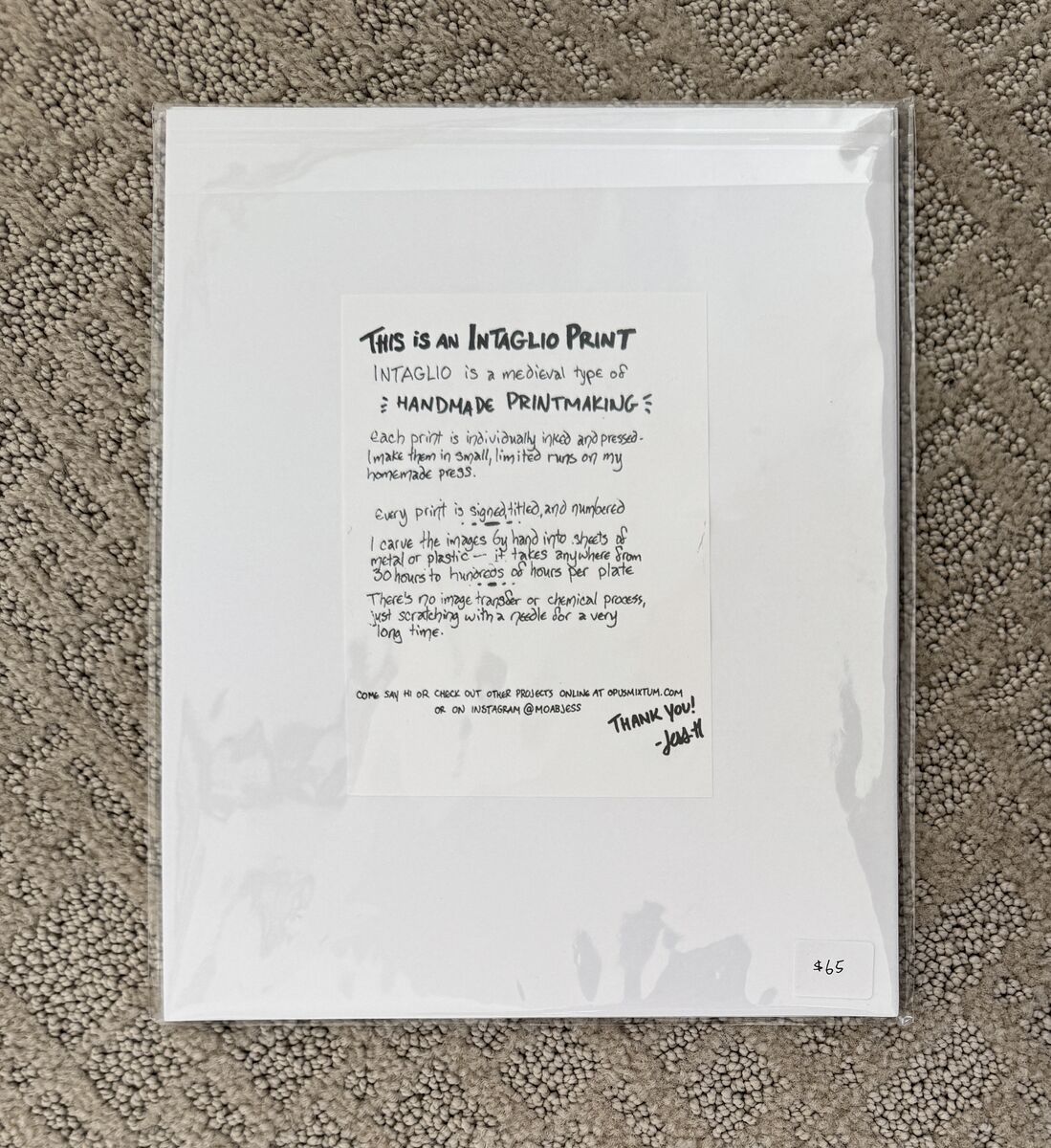 VenmoThis is an Intaglio print. Intaglio is a medieval type of HANDMADE PRINTMAKING.