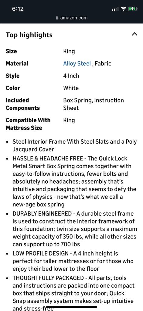 Zinus Victor 4 Inch Quick Lock Box Spring / Mattress Foundation / Built-to-Last Metal Structure / Low Profile / Easy Assembly, King, White
