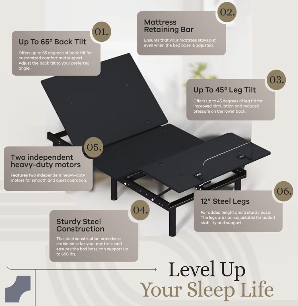 From online: “Economical Comfort & Adjustability: Elevate your sleeping experience with our head (up to 65°) and foot (up to 45°) lift mechanism, allowing for perfect positioning. By adjusting your sleeping position to the ideal angle, you can benefit from clearer airways, decreased congestion, lessened snoring, and better spinal alignment to ease back pain.
