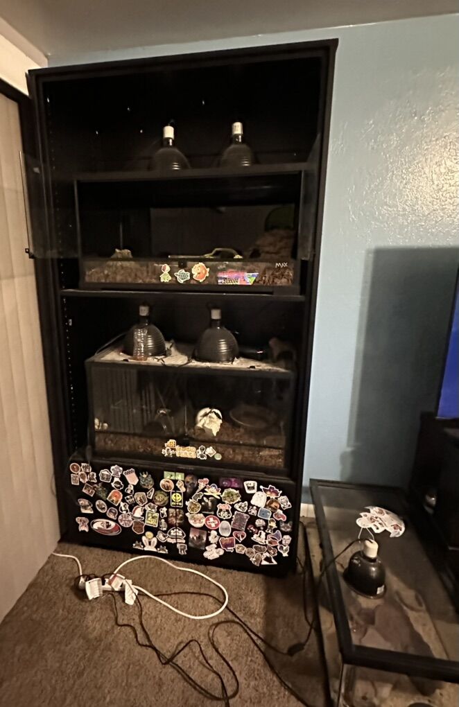 PayPalI’m getting rid of these snakes and lizards. Comes with everything in the picture. 3 aquariums the cabinet all the lights and heaters. Take it as is for best offer. You’re getting two snakes and 4 geckos.