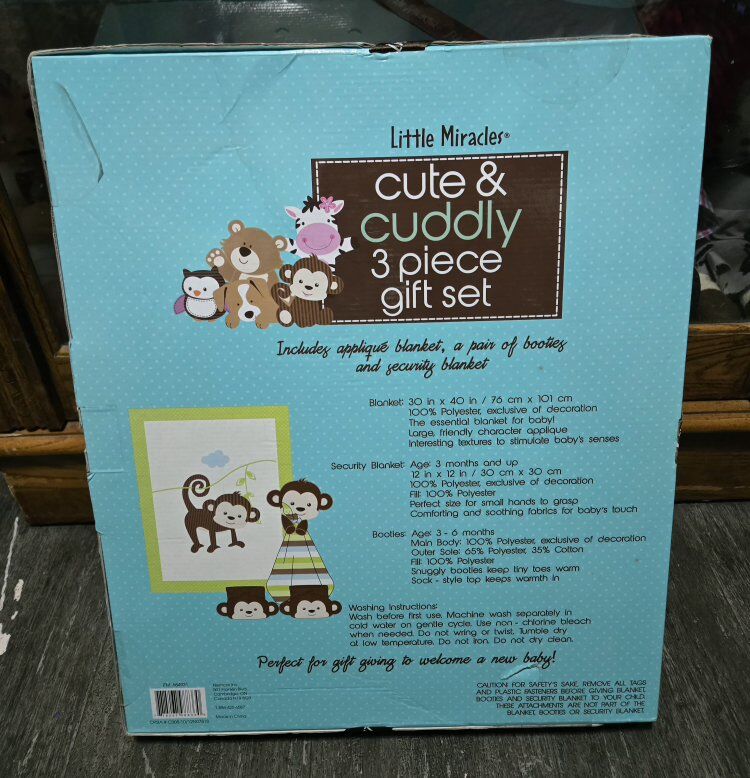Includes baby throw blanket, booties, and security blanket.