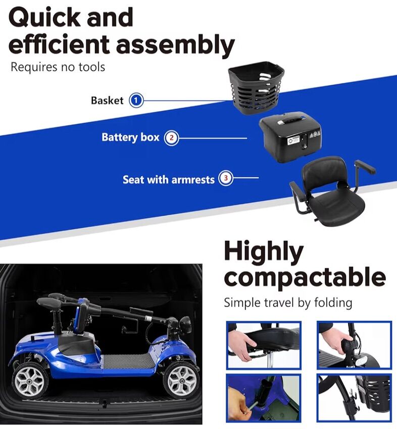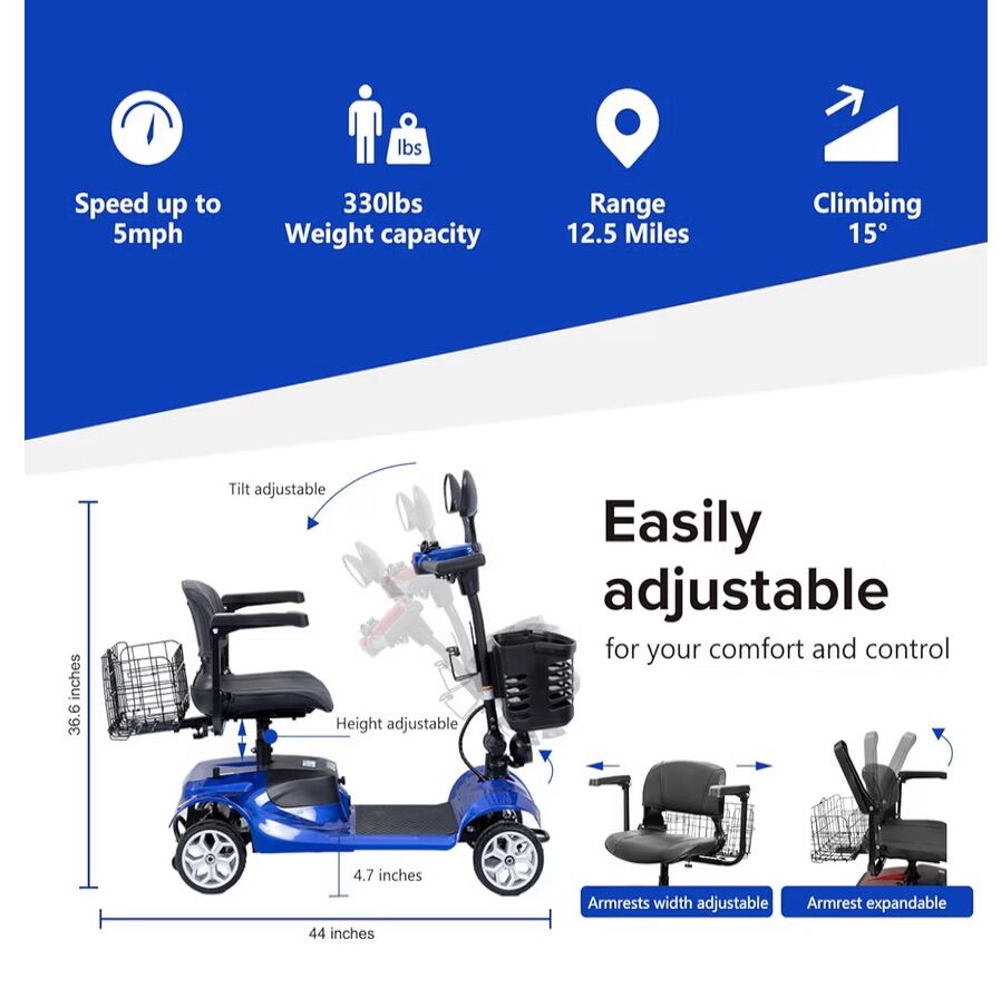 Brand HEINSY Color Blue Style Modern Material Carbon Steel Seat Width 16 Inches Seat Height 23 Inches Seat Adjustable. & Convenient Disassembly/AssemblyThis mobility scooter is designed specifically for the elderly and adults, with adjustable swivel seats and spacious legroom. It is suitable for heights of 155-190cm and can bear up to 350 pounds. Portable and easy to disassemble into four parts, convenient for car use. 10 minute speed set, suitable for people with limited mobility. Folding design saves space, ready to travel at any time, enjoy the journey. Safe DrivingTo prioritize your safety every time you ride, Heinsy senior 4-wheel electric scooter equipped with a front bumper, anti rollover wheels, LED headlights, rearview mirrors, and reflectors. The intelligent electromagnetic braking system is configured to release the controller when climbing or descending, and the mobility scooter will come to a stable stop. User-friendly Control PanelThe easy-to-use control panel includes a color battery indicator light, a horn, a headlight switch, a speed control knob, and a lock switch. The maximum speed of the electric scooter is 5 mph, and the distance traveled on each charge is up tp 16miles. Control the speed control knob and set your preferred speed. And turn on the headlights and speakers as needed. All Terrain SuitableEquipped with a shock absorption system and 8-inch solid tires, our mobility scooter can easily handle uneven terrain, easily cross obstacles, and bring you a smooth driving experience.
