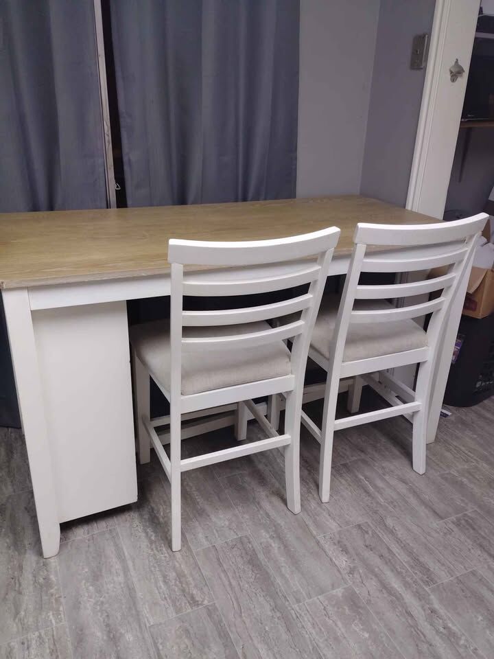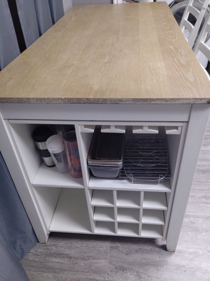 ZelleWeekend deal extended! Grab this awesome kitchen island table before it's gone! It's 62L x 36W with a white base and a light wood top. Has open shelves, cubbies, and a wine glass rack - super versatile! Comes with 2 comfy white chairs. It's made of solid wood so it's heavy, bring a dolly! Originally $800, now a steal for $165. Used but in great shape. Cash or Venmo only, text me to pick it up!