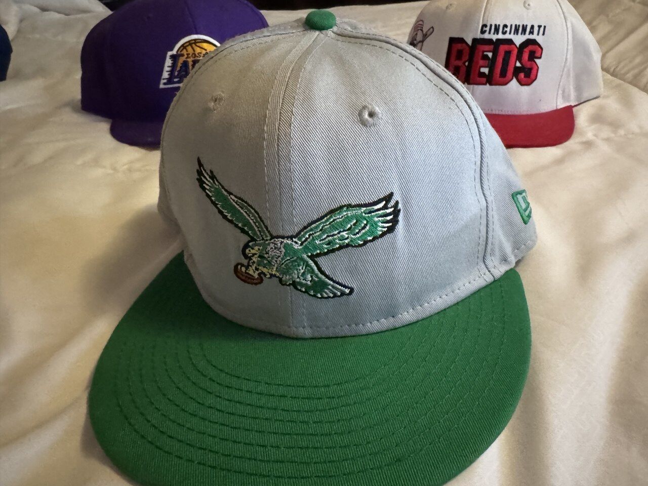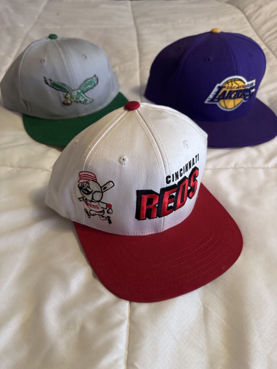 -Vintage Cincinnati Reds American Needle White/Red ATB Snapback Hat - -Los Angeles Lakers Purple Retro Nostalgia Co. Mitchell & Ness, Hardwood Classics- Size 7 7/8- -Vintage Philadelphia Eagles New Era Gray Green Embroidered Retro Logo- Size M/L-