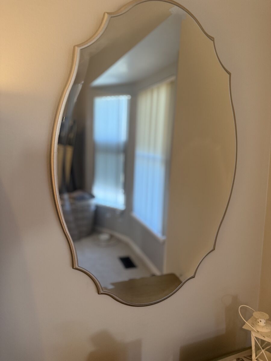 Zelle2 Beautiful decorative wall mirror with an elegant scalloped shape and soft neutral frame. This mirror adds a touch of vintage charm while still feeling clean and modern. Perfect for a bedroom, entryway, bathroom, or living space. (50.00 each) (100 both)