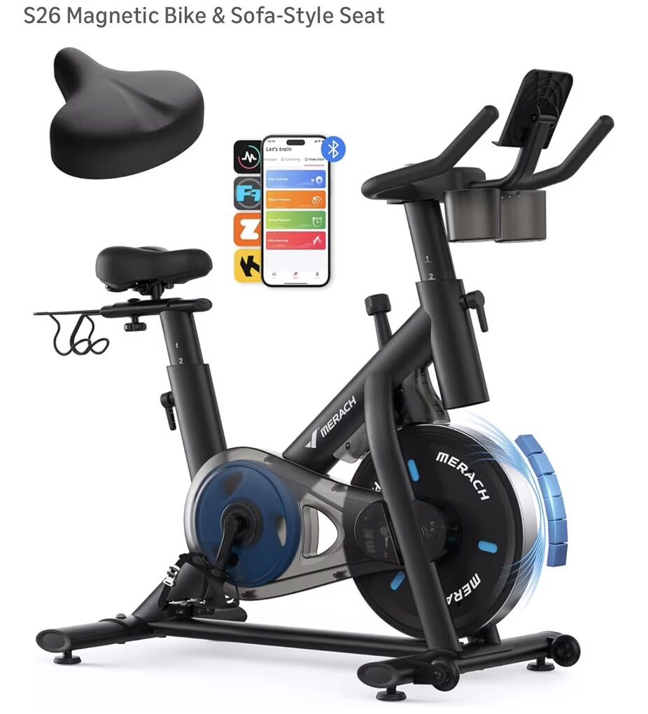 VenmoS26 Magnetic Bike & Sofa-Style Seat track real time metrics ,like distance,time,calories.Enjoy compatible with minimal and Zwift, and sync your data with google Fit and apple Health for every pedal with precision. Under maximum 300 lb loads, water bottle holder,LED display and easy moving wheels.