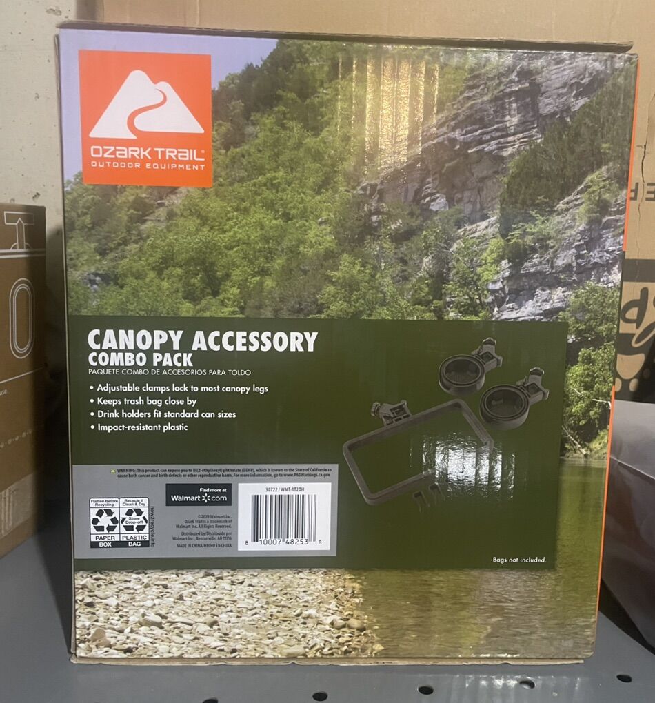 VenmoOzark Trail Canopy Accessory Combo Pack. It includes cup holders and a trash bag holder. The adjustable clamps are designed to lock onto most canopy legs. The components are made from impact-resistant plastic. The drink holders are sized to fit standard cans.