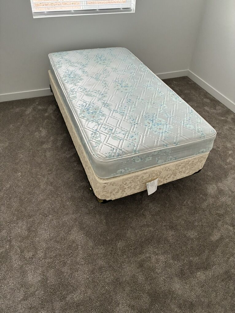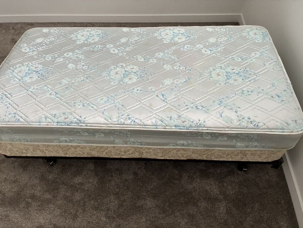 Barely used: Twin bed mattress Twin bed box spring Twin bed frame All included Smoke free home