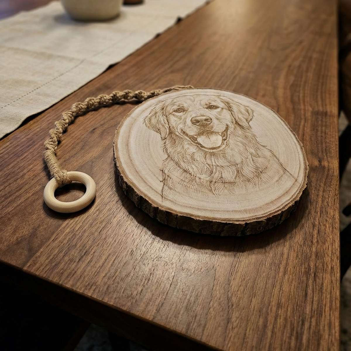 • Beautiful 8-9 inch natural wood tree slice with authentic bark edges, creating a one-of-a-kind rustic aesthetic • Precision laser engraving of your portrait and personalized text, capturing every detail with remarkable clarity • Available with your choice of single or double sided engraving • Includes your choice of a sawtooth wall hanger, a jute rope wall hanger, or a complementary display stand for perfect presentation on any shelf, mantel, or tabletop • Each piece uniquely showcases the natural wood grain patterns, making your keepsake truly one-of-a-kind • Can be personalized to include text of your choice • Unlimited revisions included, we’ll fine-tune your portrait until it’s perfect. • Once approved, your custom portrait is engraved and shipped directly to your door. • Perfect thoughtful gift for anniversaries, birthdays, weddings, housewarmings, or any special occasion