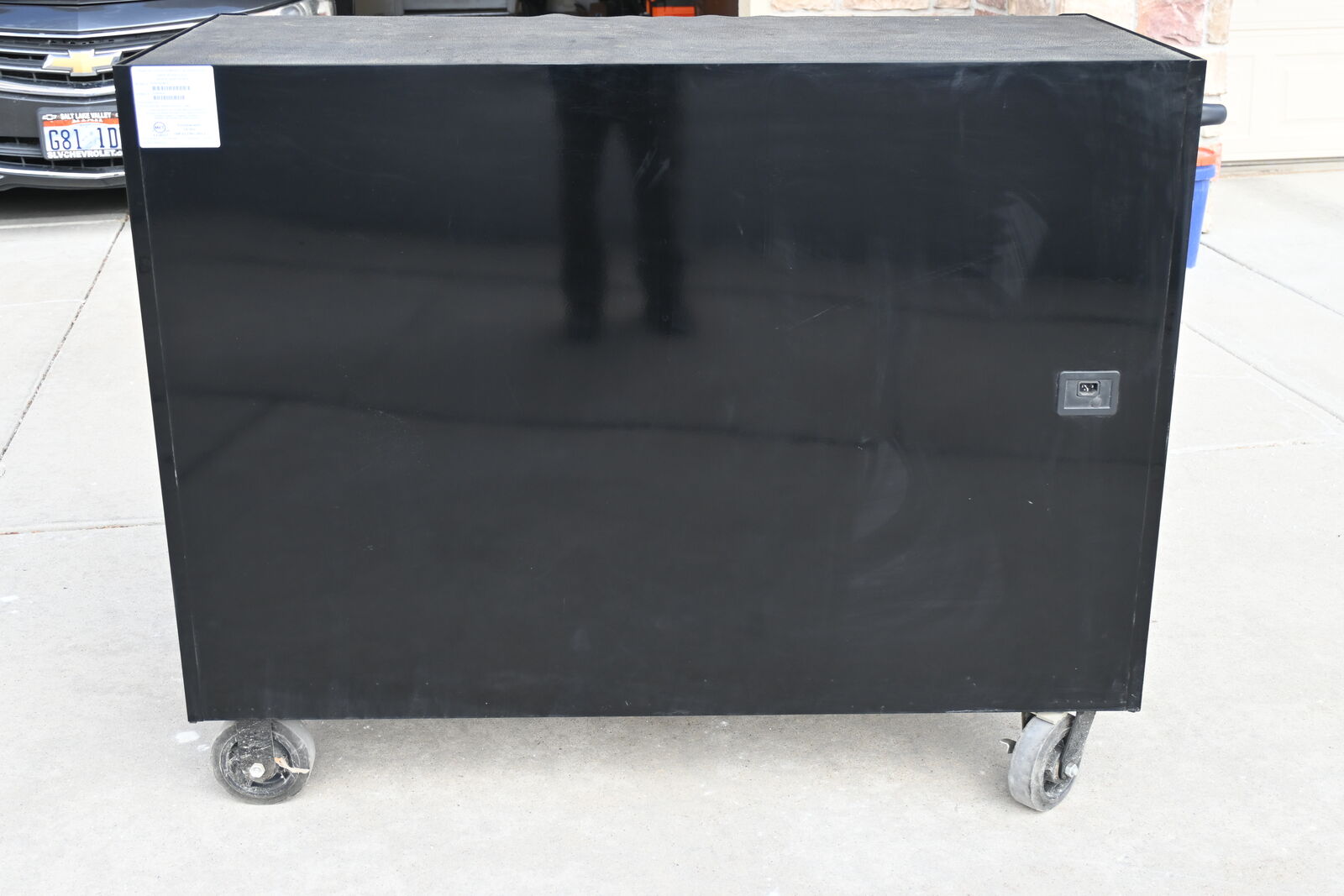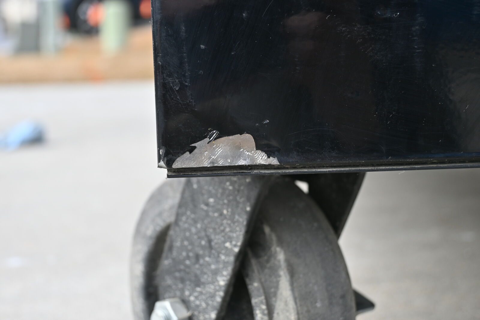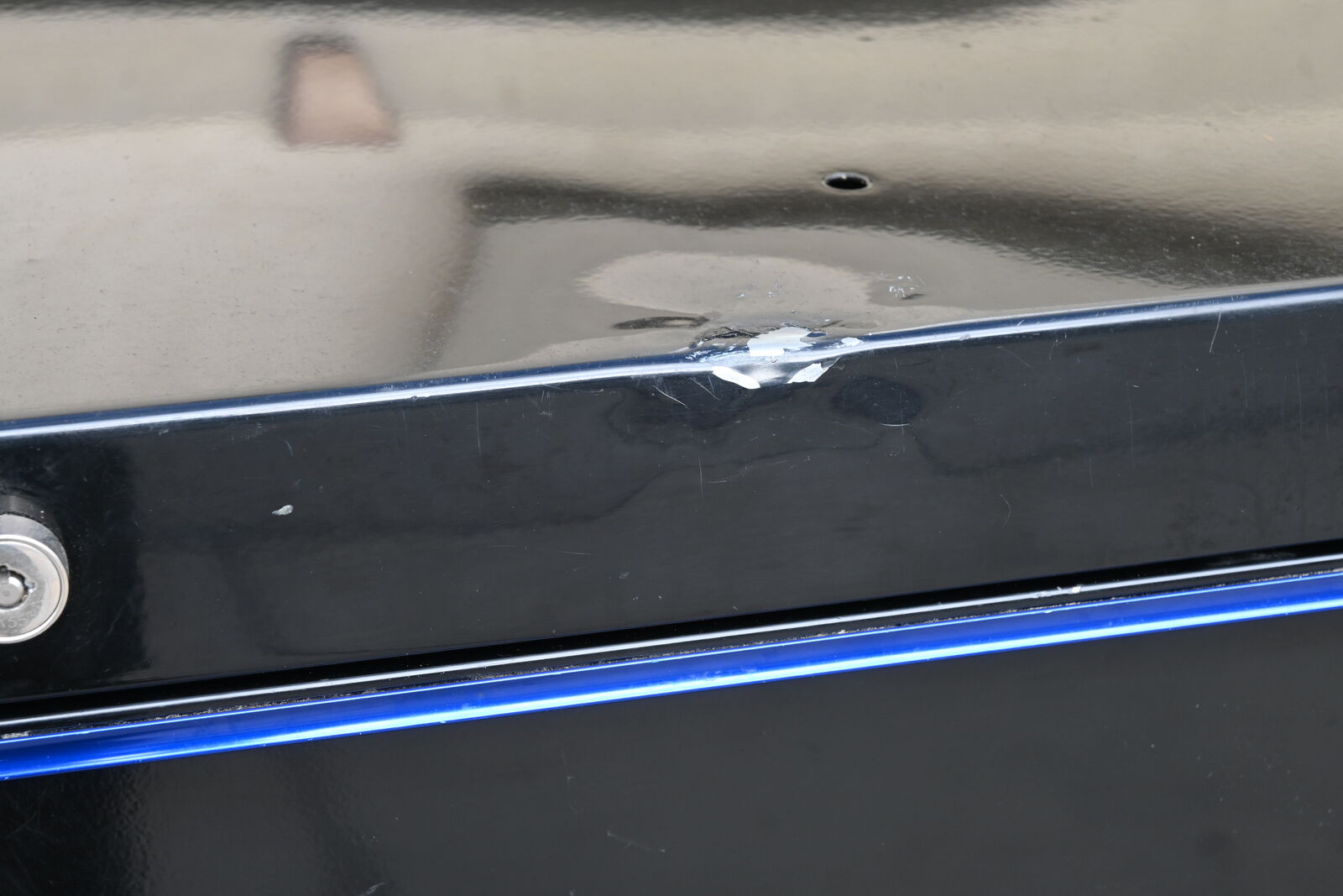 Has a dent on above top drawer from from when it was once being off loaded off a truck by crane. I did my best to push the dent out, the top is slightly deformed, it has not hindered any function of the drawers, it just looks ugly. It has another dent near one of the casters that I don't recall how it happened.