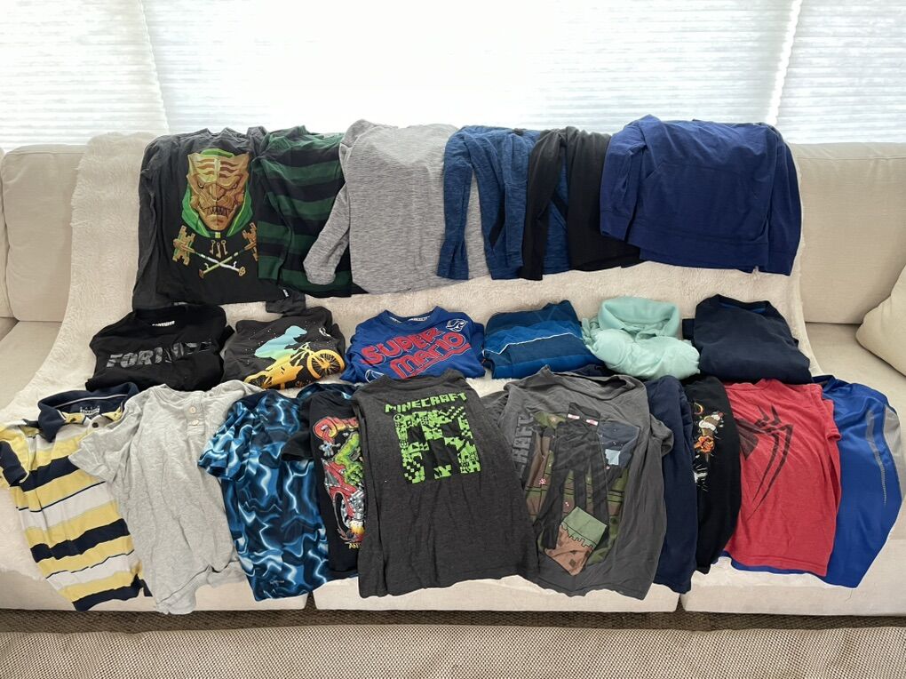 Large lot of boys’ clothes in good used condition. All items have been worn and show normal use, but no holes or major damage. Everything is freshly washed and ready to go.