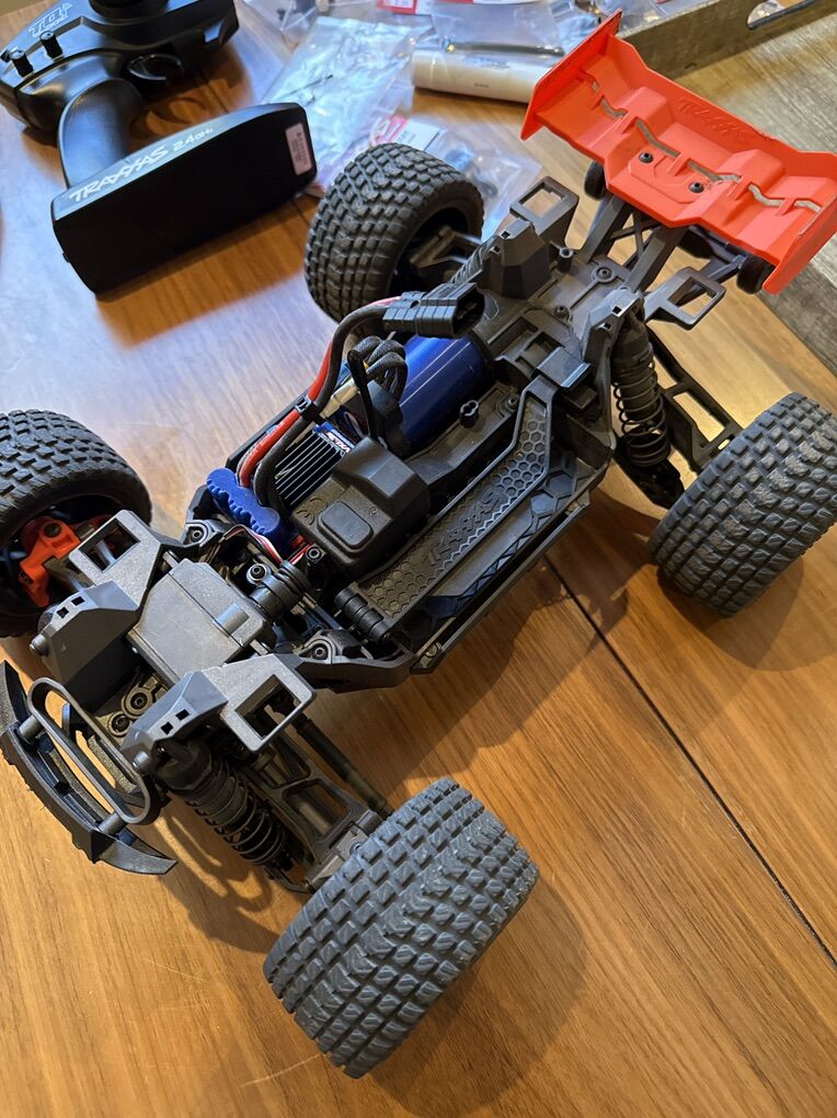 Everything in the picture is included. The stock 2s battery and ID connection. There’s some spare parts that I had to replace (steering blocks, c hubs, etc). It’s upgraded to a 21t pinion to help manage it in 3s which did make a lot of difference. Haven’t had any overheating issues.