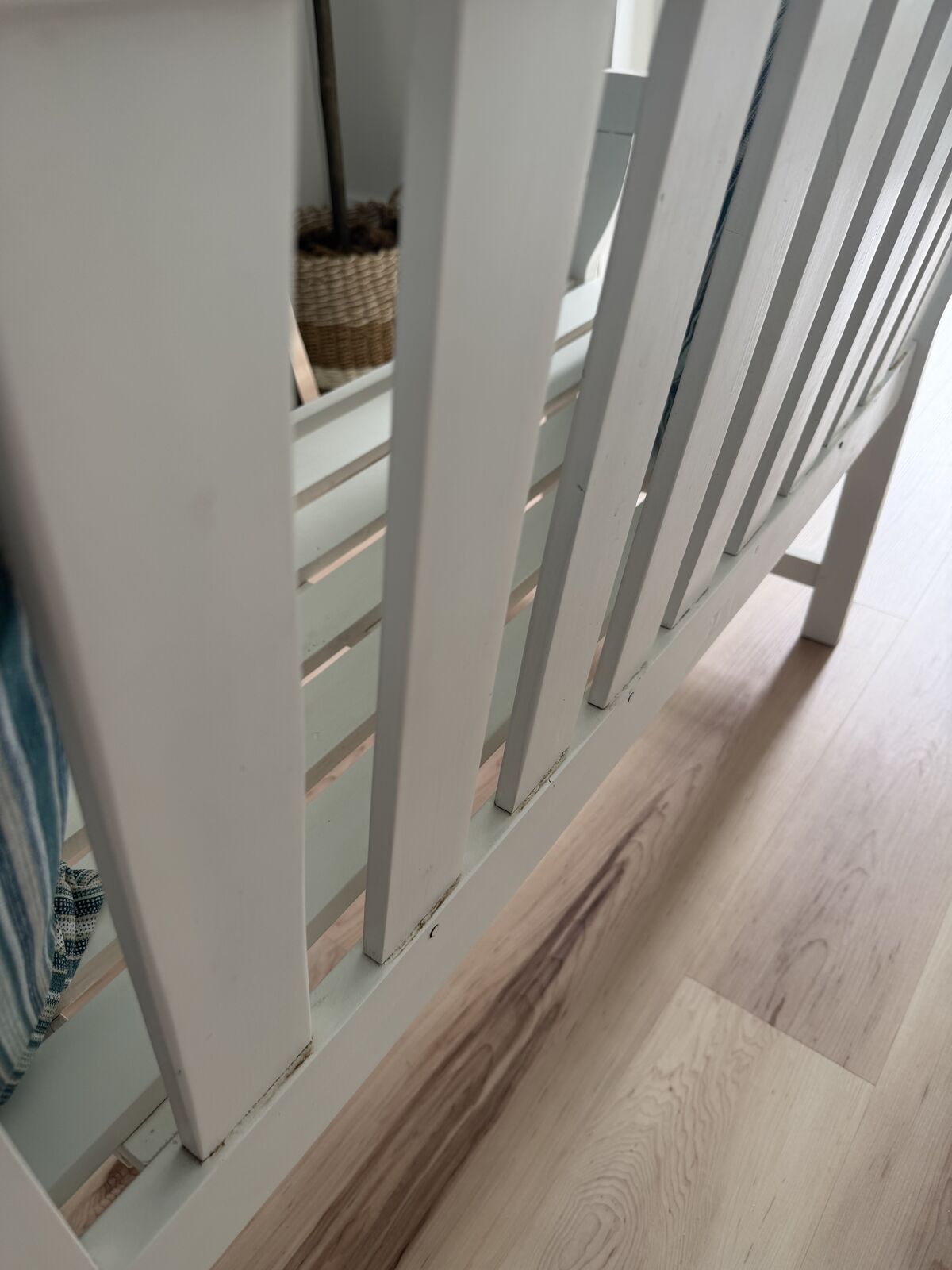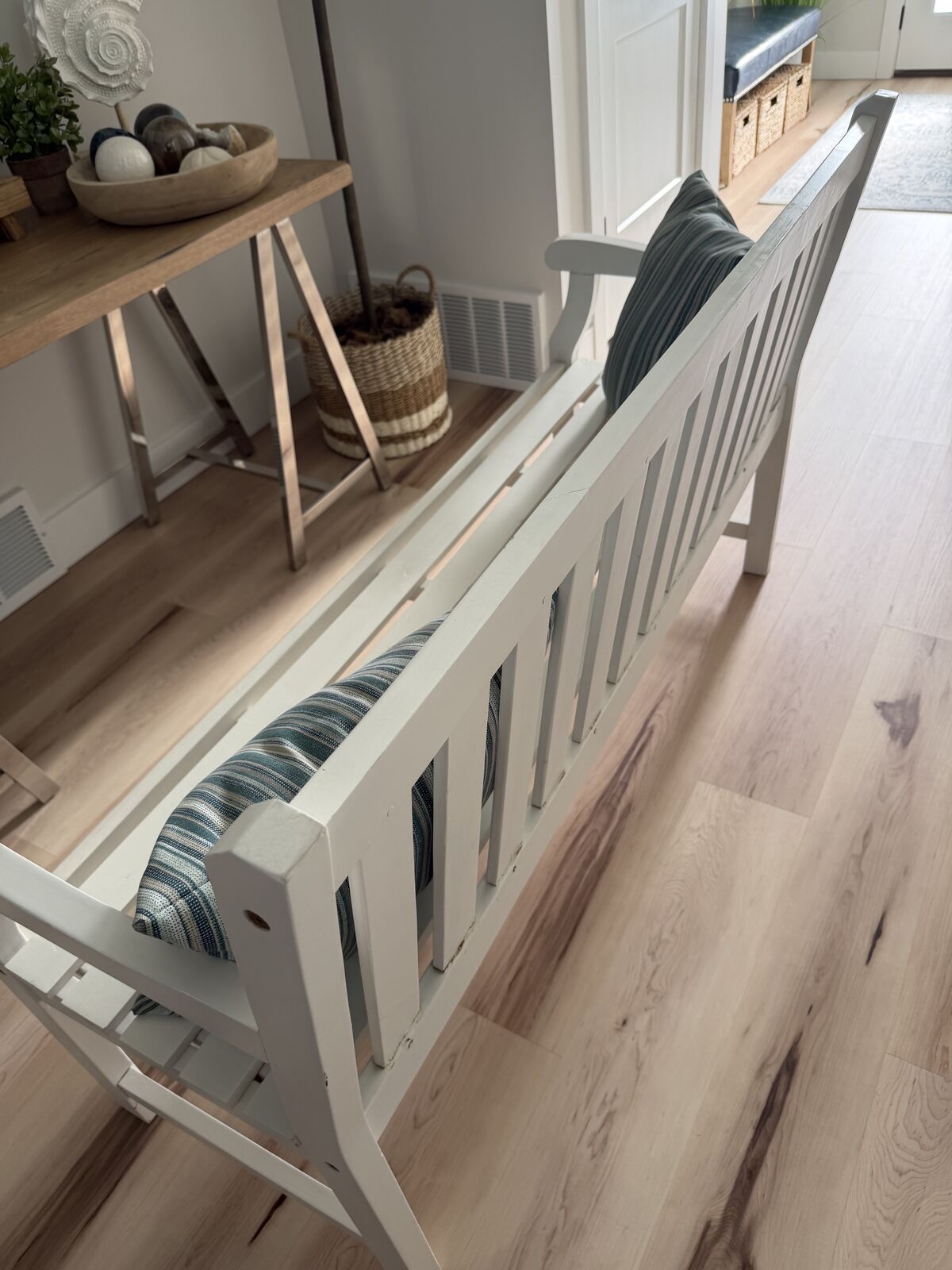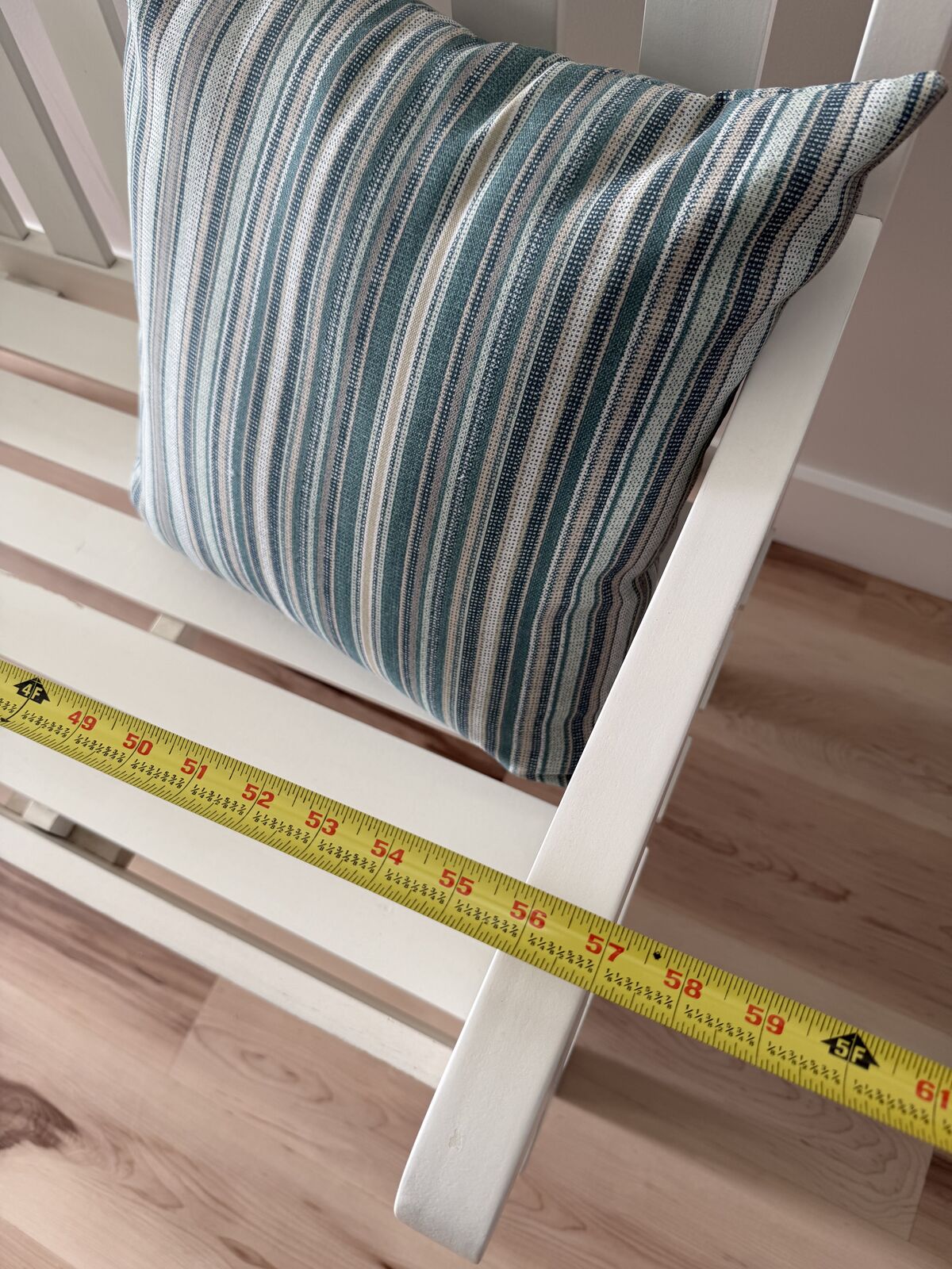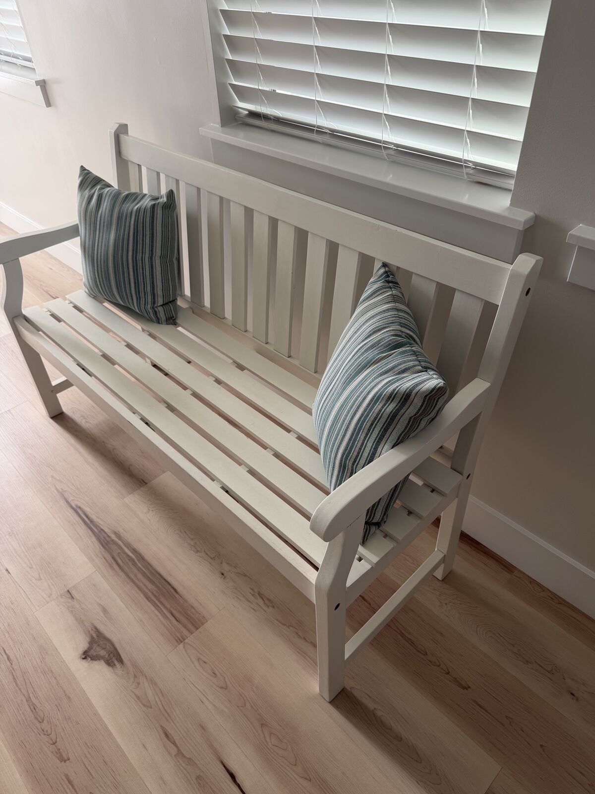 White painted wood porch bench With 2 pillows. 60" x 23". Normal wear and tear, see photos!. Paid $220 yours for only $70 Pick up in Kaysville