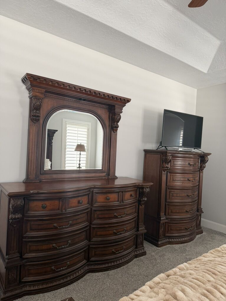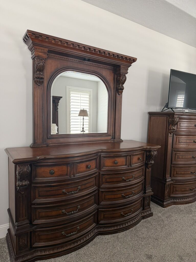 Beautiful solid wood traditional bedroom furniture set, purchased around 2008. This is a high-quality, very sturdy set with ornate carved details, curved drawer fronts, and a rich dark wood finish. Extremely well made and very heavy.