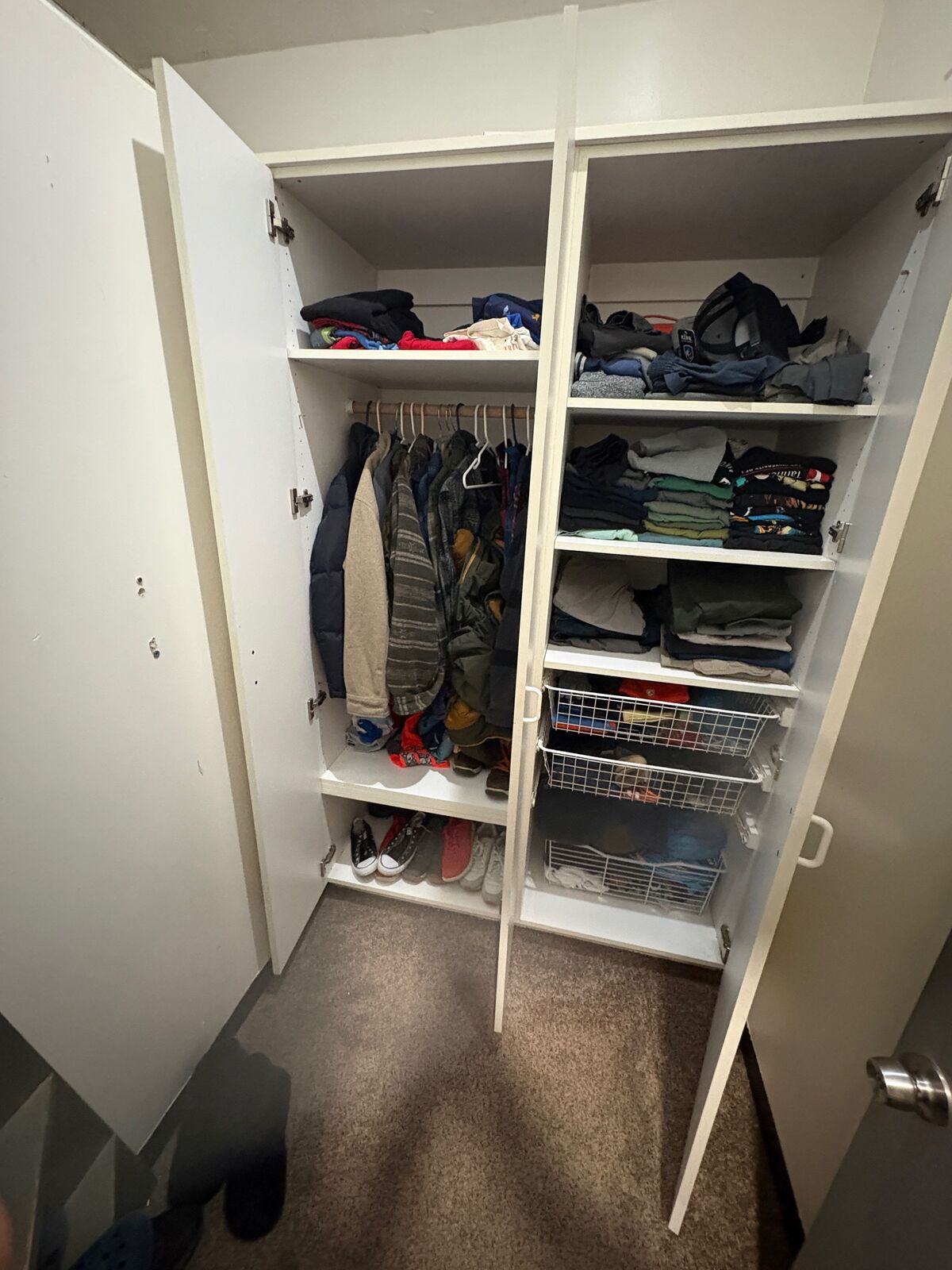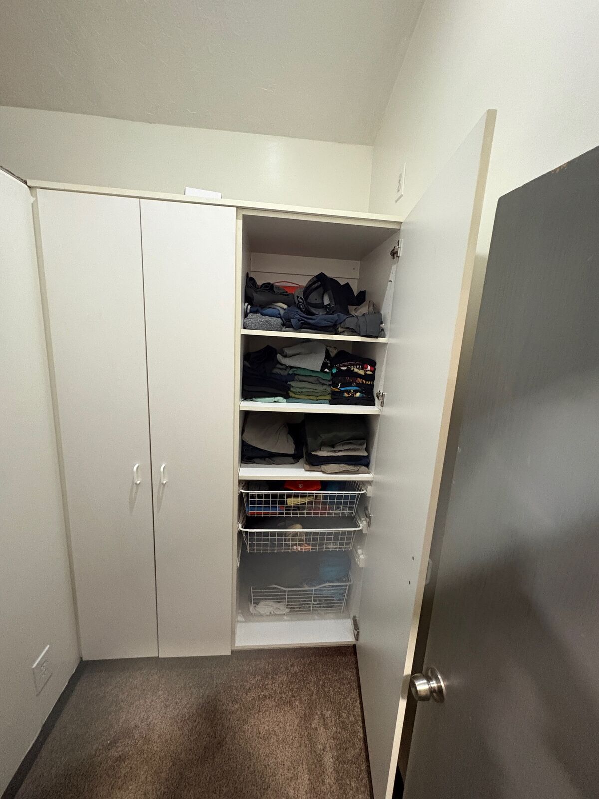 clothes are not included . It is basically 2 cabinets joined/screwed together and can be seperated with just few screws. I will try to get better pics with it emptied next weekend(if it is not sold by then)