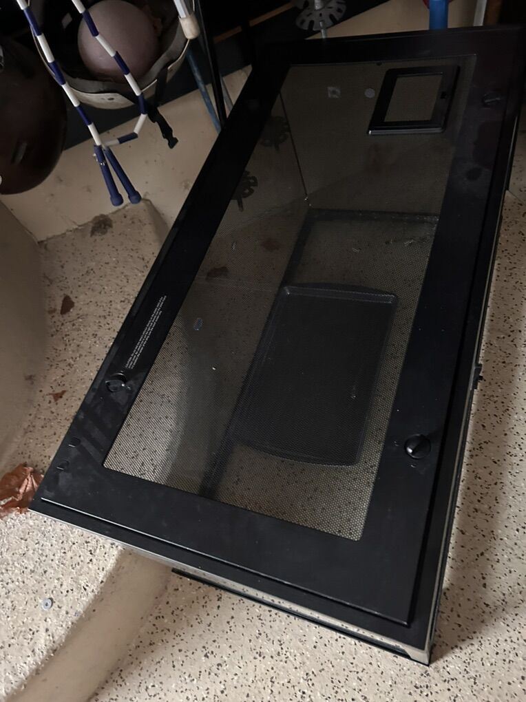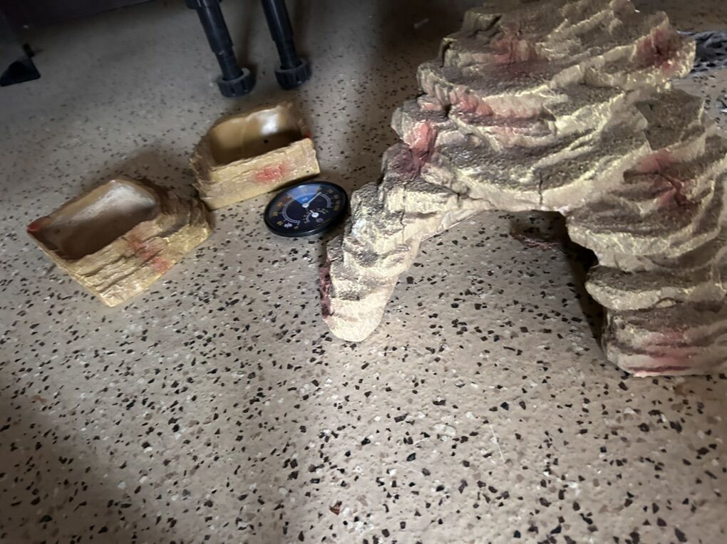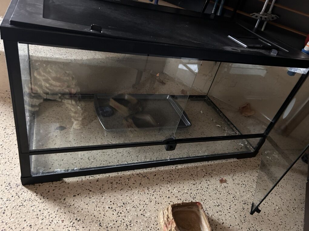 Venmo40 Gallon reptile terrarium. Front opening doors. Medium sized hideaway rock. Not pictured, but includes two large heating lamps. Feeding bowls. Driftwood. Thermostat. Sand tray.