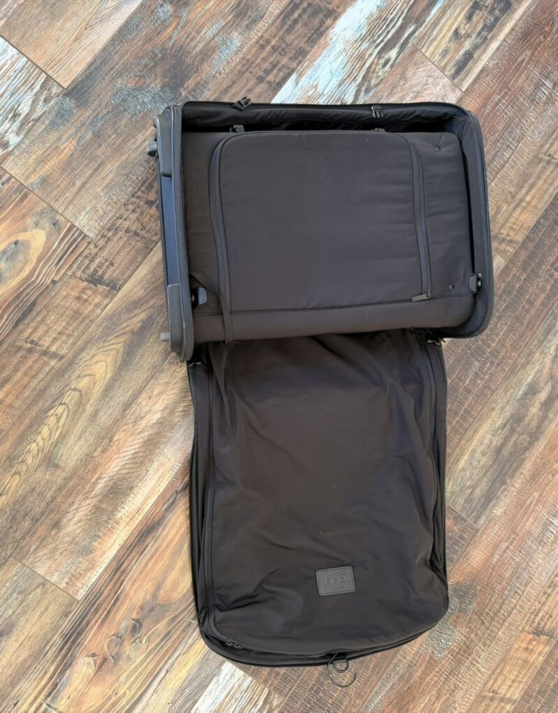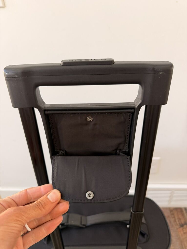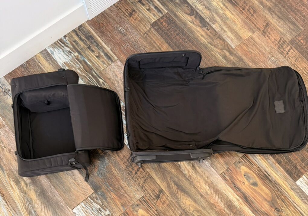 Vocier C38 travel luggage. Clamshell design opens to reveal a dedicated garment compartment with a structured folding frame and secure fastening system that keeps clothing smooth, and crease-free. A secondary, removable compartment provides additional space. Fits in carry on space, smooth rollers, telescope handle, excellent quality. Slightly used.