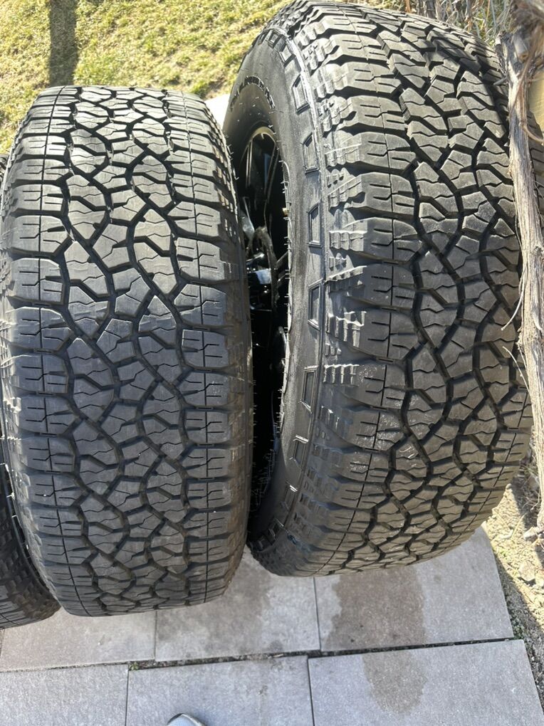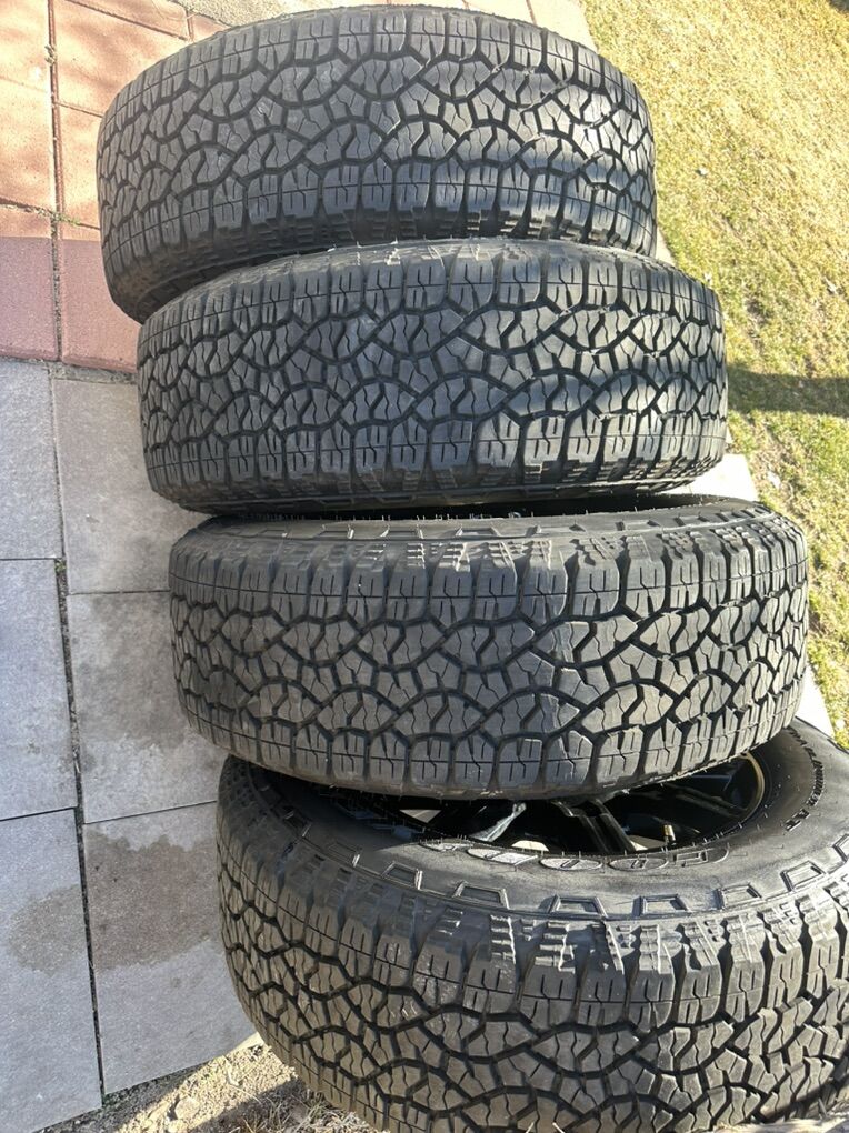 Set wheels and tires of 2025 GMC sierra AT4 3500 Size 275/65/20 tires are Goodyear wrangler trail Runner AT Lees 100 miles and them Load E 10 ply 8 lug not TPMS sensors