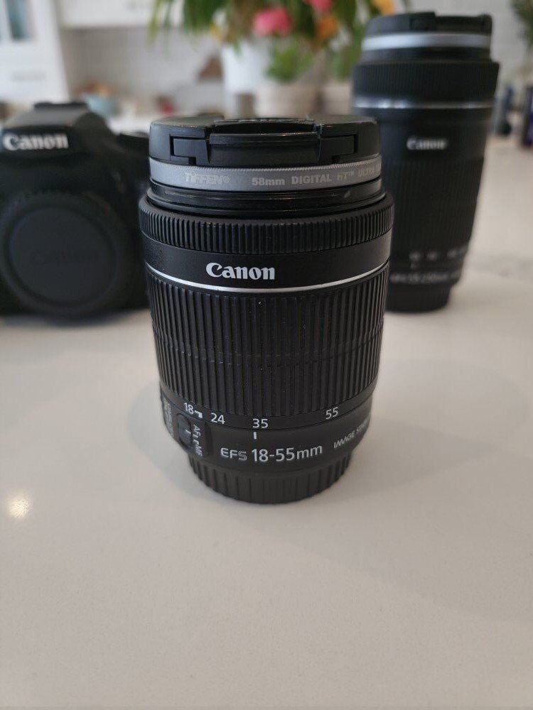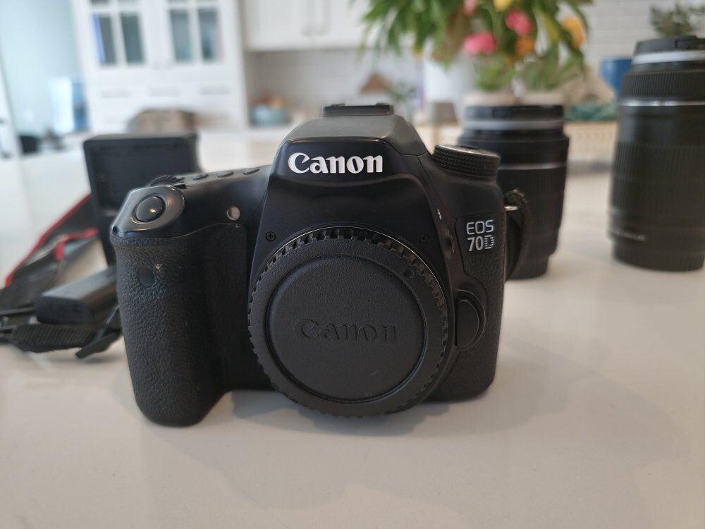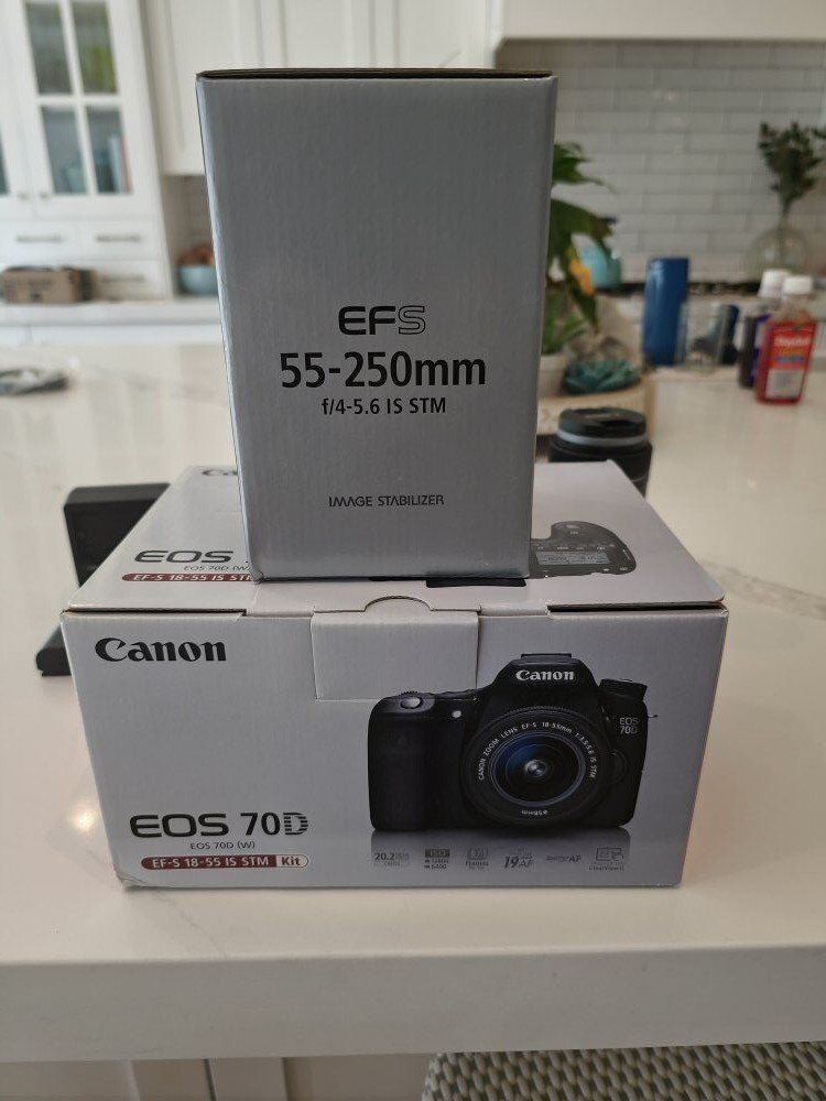 ZelleCanon EOS 70D with EF-S 18-55mm IS STM & 55-250mm IS STM lenses. Two Canon batteries and a Canon wall charger. A Canon Gadget Bag 300DG that was never used because i used a sling bag for my gear. I have all of the boxes, manuals, paperwork, cables, everything. The STM lenses are quieter when focusing than the standard IS or IS II lenses, which is great for shooting video. It's been a great setup and I'm only selling because I'm switching brands. $600 OBO. Make an offer.